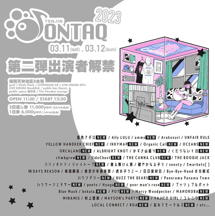 2023年3月11日(土)、3月12日(日)に福岡市・天神地区ライブハウス複数会場にて開催されるライブサーキット『TENJIN ONTAQ 2023』の第二弾出演者が発表された。