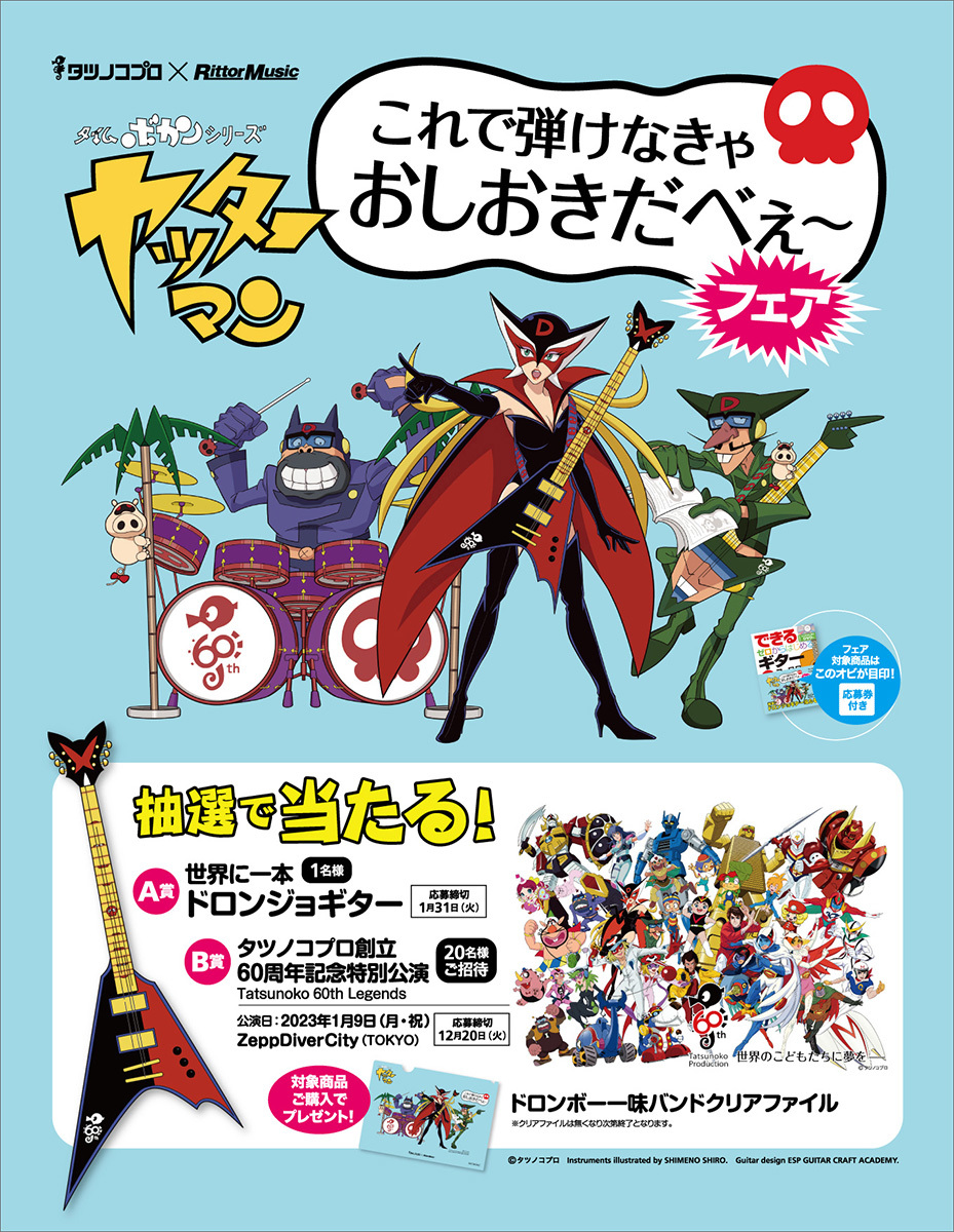 株式会社リットーミュージックは、株式会社タツノコプロの創立60周年を記念したコラボレーションキャンペーンとして『タツノコプロ×リットーミュージック タイムボカンシリーズ ヤッターマン これで弾けなきゃおしおきだべぇ~フェア』を全国の一部書店、楽器店にてスタートした。