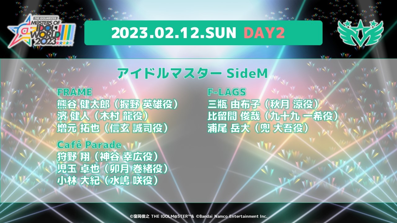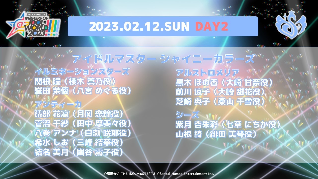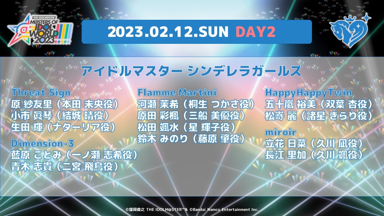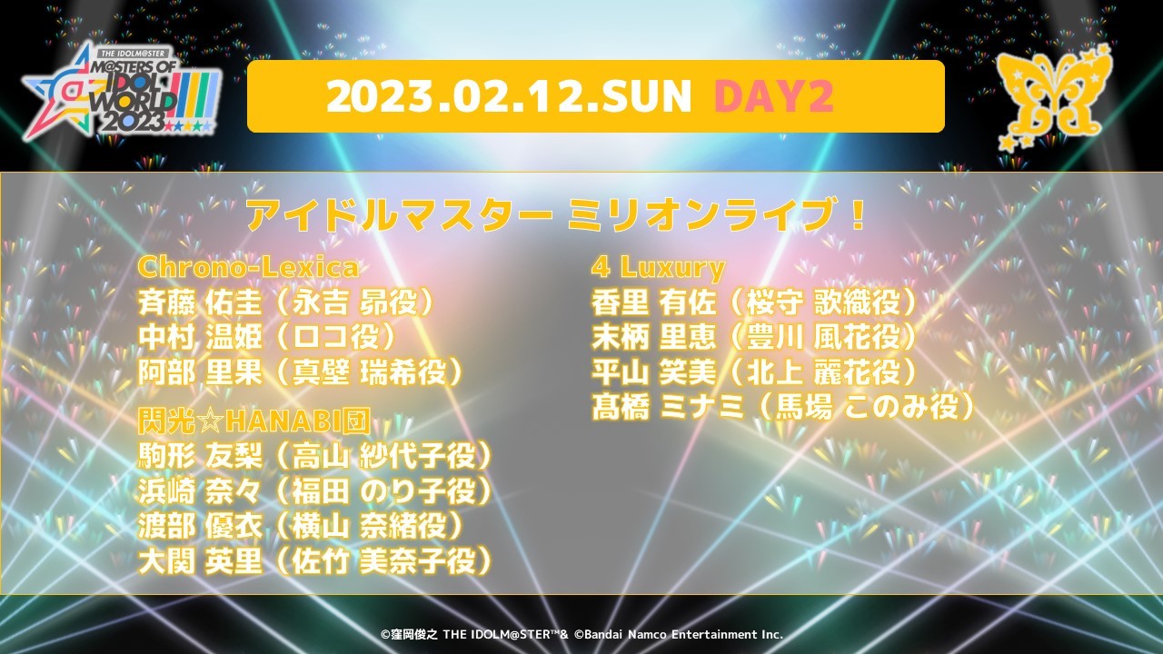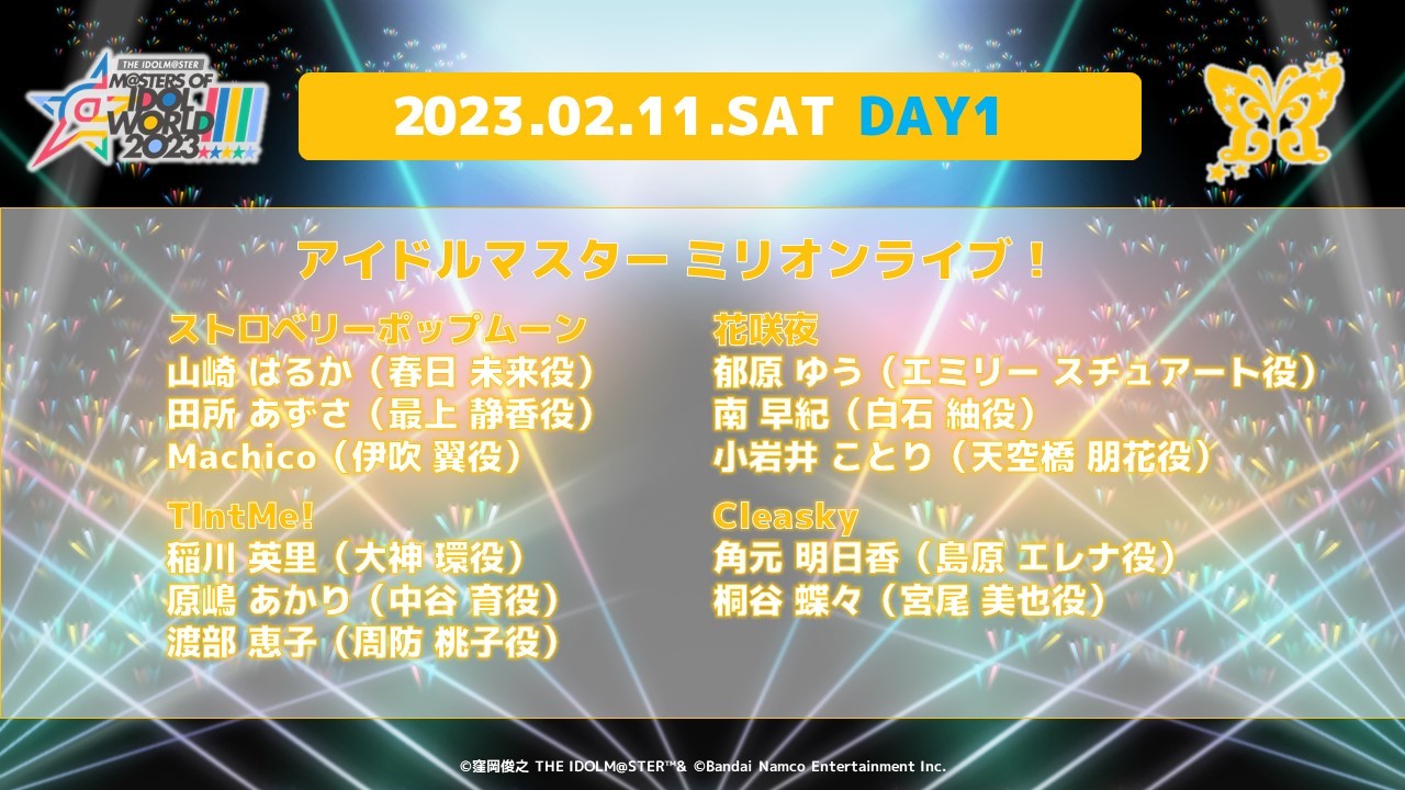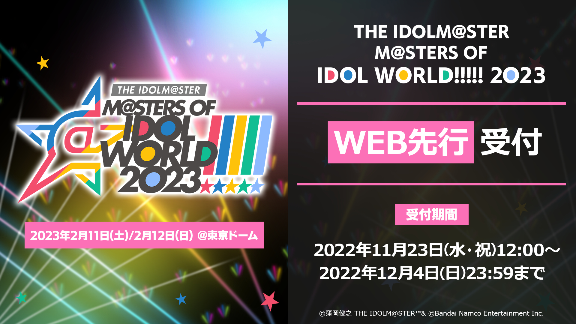 2023年2月11日(土)・2月12日(日)の2日間、 東京ドームにて開催される「アイドルマスター」シリーズの全5ブランドが出演する合同ライブ「THE IDOLM@STER M@STERS OF IDOL WORLD!!!!! 2023」のチケットWEB先行受付が本日11月22日(火)12:00より開始された。