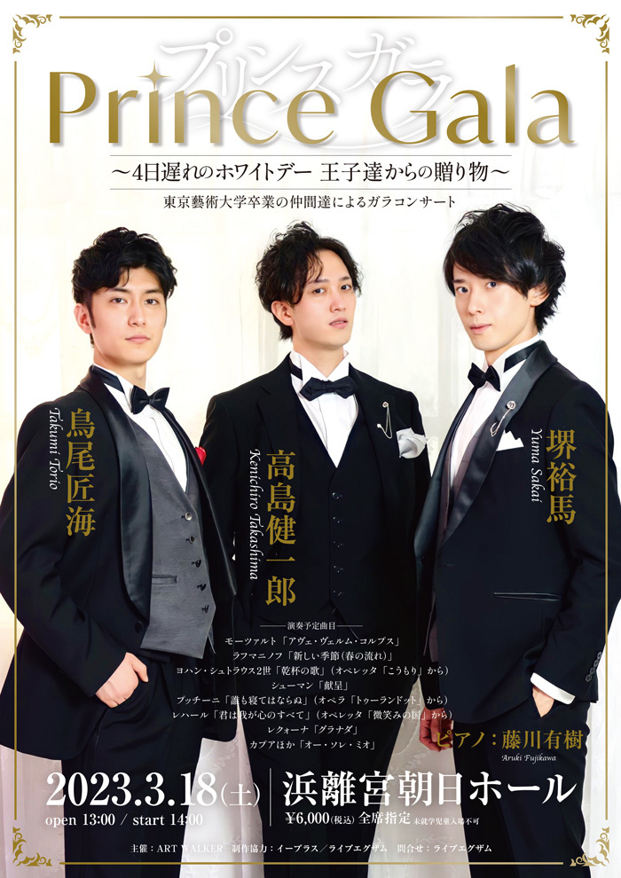 まさに三者三様。同じ歌手とは言え、キャラクターの違う3人が集まったので、とてもバラエティに富んだ楽しいコンサートにできる気がします。タイトルも、『プリンス・ガラ~4日遅れのホワイトデイ 王子たちからの贈り物~』というかなり振り切ったタイトルを付けて、自分たちからまずは楽しんで行こうと思っていますので。僕は、やはりウィーンで学んだことを活かすためにもヨハン・シュトラウスやレハールをやってみたいと提案してみたり、鳥尾君からは彼のキラキラした声質にあった「グラナダ」をやってみたいという声が上がったり、バリトンの堺さんはいまだ長考中だったりと、早くもキャラクターの違いがはっきりしてきてますね。