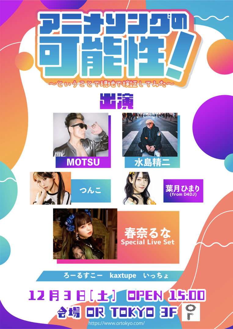 本連載にこれまで登場いただいた水島精二、MOTSU、つんこ、葉月ひまりのDJプレイに加え、春奈るなSpecial Live Set、そして出演者によるトークショーもお届け予定だ。