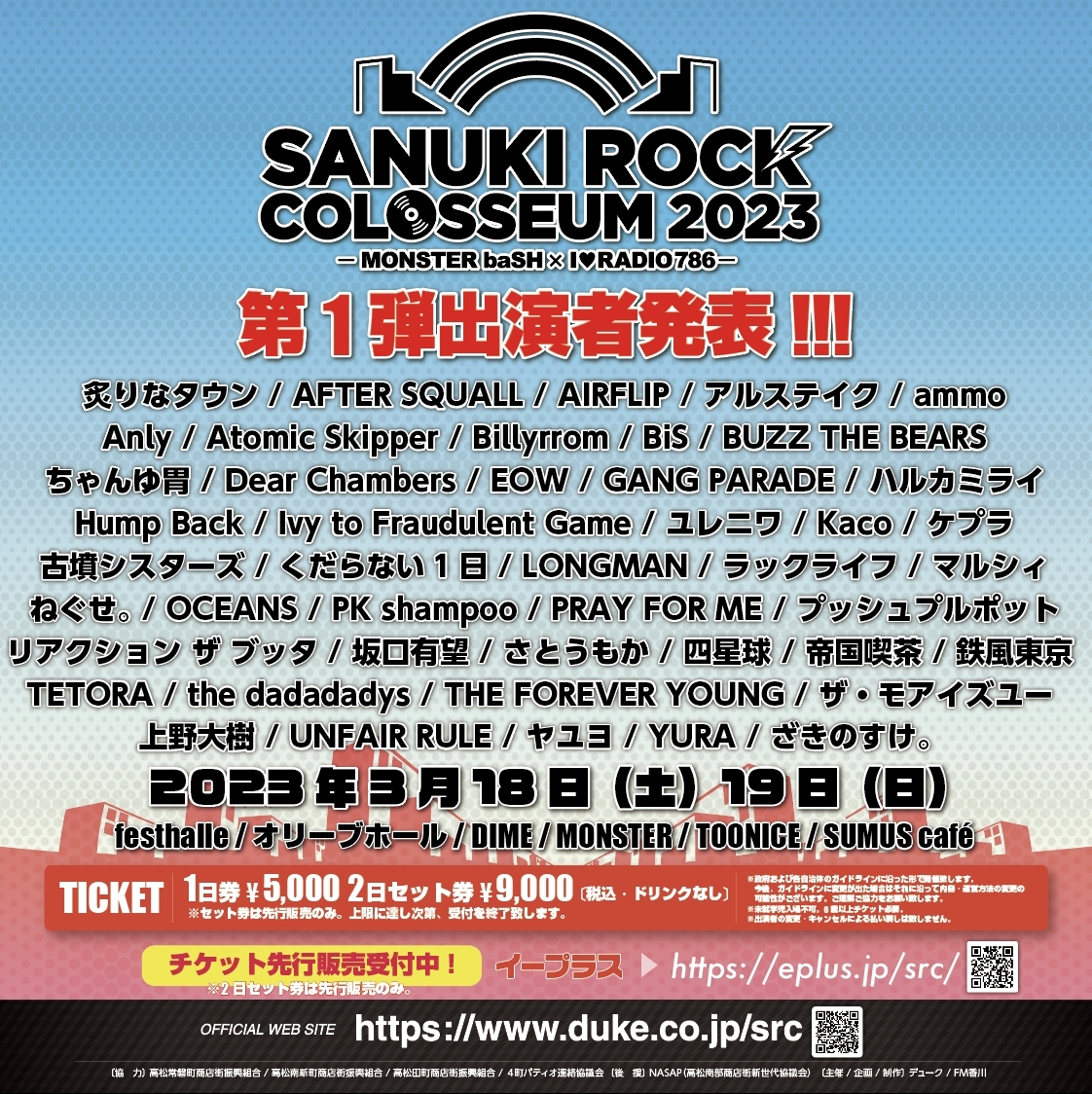 2023年3月18日(土)、19日(日)の2日間、香川・高松市内にて開催される街ごとライブサーキット『SANUKI ROCK COLOSSEUM 2023 -MONSTER baSH × I♥RADIO 786-』の第1弾出演者が発表された。