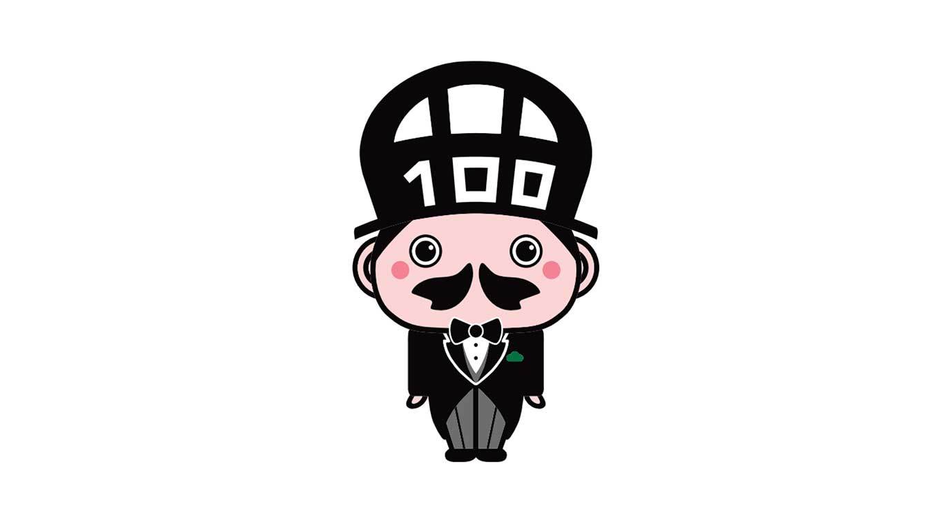 そして第二弾として、大阪松竹座の公式キャラクターが誕生。制作したデザイン学科 大島美海によると、大阪松竹座の外観正面のアーチを模し、窓には100の文字が刻まれているハット、大阪松竹座の緞帳「有職麗華」の紋様をモチーフにした「ひげ」、松の形のポケットチーフがチャームポイントとする。