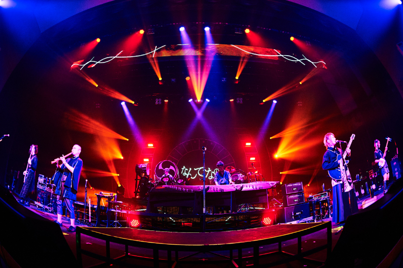 18時30分に開演すると、Overtureに乗せて、黒流(和太鼓)、町屋(ギター&ヴォーカル)、亜沙(ベース)、山葵(ドラム)、いぶくろ聖志(箏)、神永大輔(尺八)、蜷川べに(津軽三味線)が観客に手を振りながら登場。アルバム同様、1曲目はリード曲「フォニイ」。ステージ中央にはマイクスタンドが置かれ、鈴華の姿はないが、ヴォーカル音源が会場に鳴り響く。「エゴロック」「グッバイ宣言」と、アルバム収録曲を連打。その楽曲の鈴華の歌声に、ユニゾンしたりハーモニーを奏でたりと、まずは町屋がヴォーカルを補っていく。曲の世界観を表すカラフルなアニメーションに重ね、LEDヴィジョンに投影される歌詞。文字は曲に合ったフォントが選ばれ、縦書きだったり横書きだったり、列が乱れてバラバラに散っていったりする一連の演出は、どこか動画投稿サイトを想起させる。