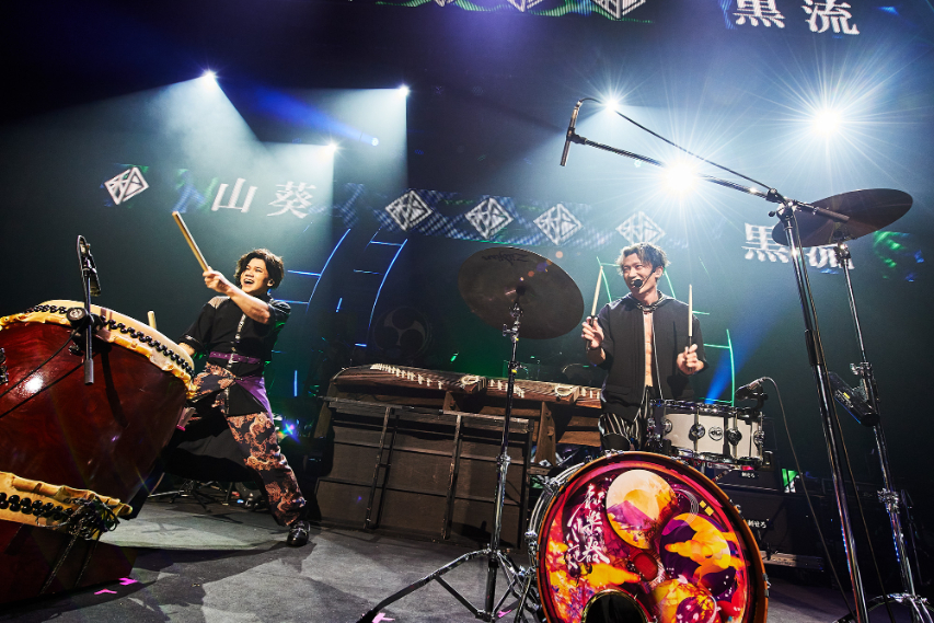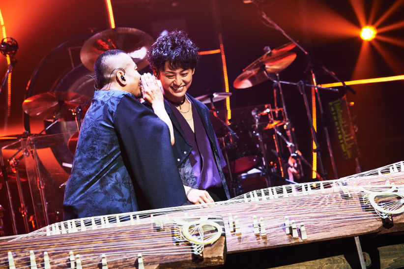 『ボカロ三昧2』収録曲の中で1曲だけ、しっとりとした和の魅力を湛えたバラード曲「紅一葉」は、いぶくろの雅やかな箏の音色からスタート。今回は4面の箏がステージ中央に並び、それだけでも壮観な眺め。いぶくろは、4面の端から端まで動き回ったり大きく腕を伸ばしたりしながら、ダイナミックに、時に優雅に爪弾いていく。月が浮かぶ夜空を思わせる映像を背に、蜷川がセンターに立ちヴォーカルを披露。普段は、ヴォーカルは元より、コーラスもしない蜷川がメインヴォーカルをとる事が大きな驚きであったが、その歌声に6人は寄り添うように音を重ねた。「ベノム」ではジャンプを繰り返すなど、神永は尺八を吹きながら身体を大胆に動かし、ステージを隅々まで勢いよく走り回って会場を大いに盛り上げた。「いーあるふぁんくらぶ」は、力強くキックを踏み続ける山葵が、中国語のなめらかな語りを披露。黒流と打楽器対決を繰り広げる「ドラム和太鼓バトル~打演飛動~」ではパワフルなドラミングに加え、上着を脱ぎ捨て、鍛え上げた筋肉を見せつける一幕も。メンバー一人一人に主役となる見せ場があり、音楽と共にキャラクターも伝わってくる、総合的なエンターテインメントショウが繰り広げられていく。