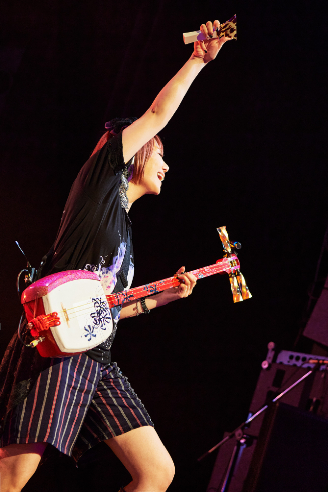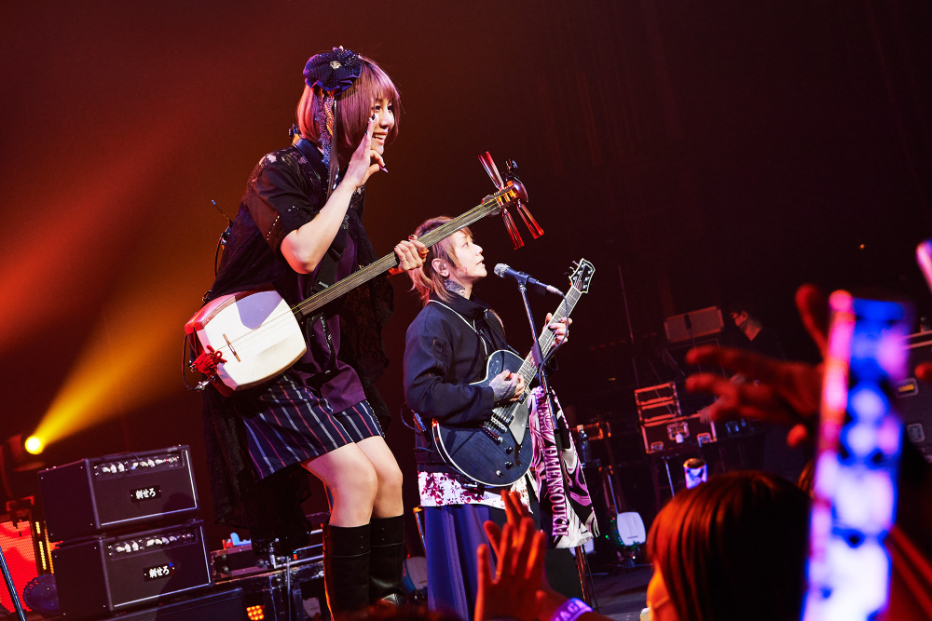 『ボカロ三昧2』の収録曲は、CD・配信それぞれの限定曲含む13曲もれなく披露。ボカロカバーアルバム『ボカロ三昧』でデビューした彼らにとって、原点回帰とも言えるコンセプトだが、ボカロシーンは8年前にも増してBPMの高速化が進み、メロディーが激しく乱高下するなど、難易度も高い傾向があるという。それをただ機械的に再現するのではなく、原曲には含まれていない和楽器を使っていかに表現をするか?は、アレンジ面でも演奏面でも、メンバーの腕の見せ所になってくる。通常ロックバンドのライヴでは目にすることのない楽器の数々を目にしたり、その音の響きを生で聴いたりするだけでも新鮮で、刺激的な体験だ。蜷川の背後には、ファイナルのこの日に1棹増えて、全8棹の三味線がラインナップ。KOGEI Nextとのコラボレーションで生まれたという、世界に一台だけの蜷川べに専用エレキ三味線“Lycoris”をツアーで初めてお披露目したのだが、漆塗りの赤いボディーは遠目にも艶やかに輝いていた。