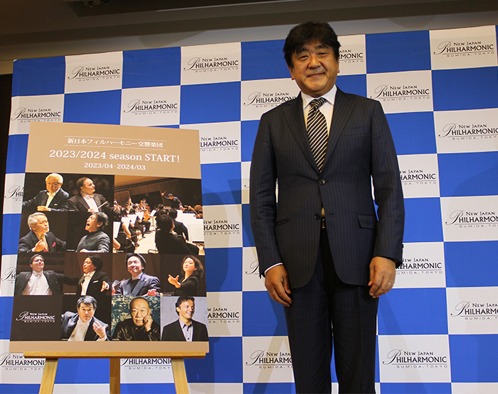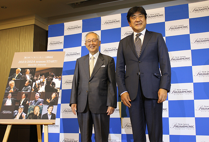 新日本フィルハーモニー交響楽団(以下新日本フィル)が本拠地を置く東京都墨田区で、2023/24シーズンの定期演奏会プログラムについての記者発表会を開催。現在ミュージック・アドヴァイザーを務め2023年4月から第5代音楽監督に就任する佐渡裕と、同楽団理事長の宮内義彦が登壇し、新シーズンの展望や今後の抱負などについて語った。(文章中敬称略)