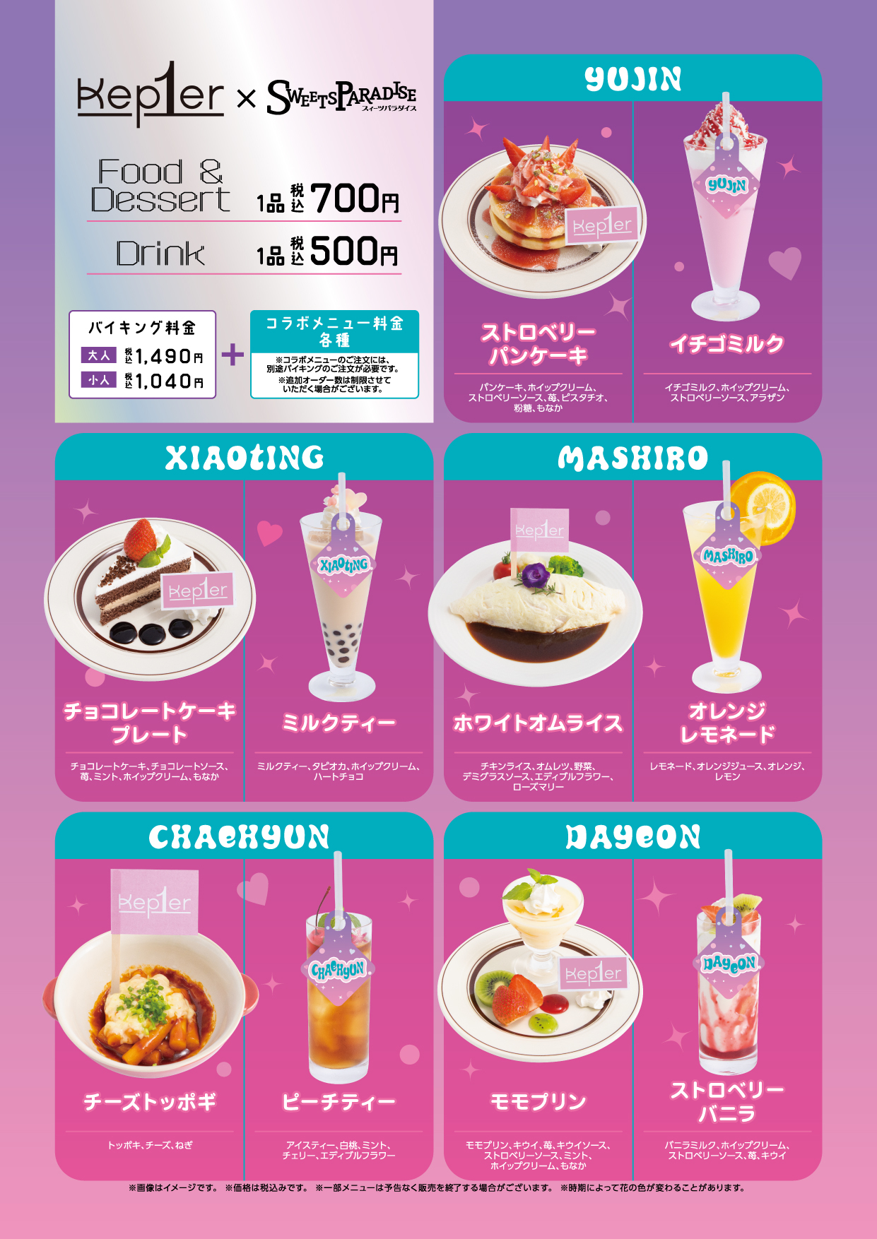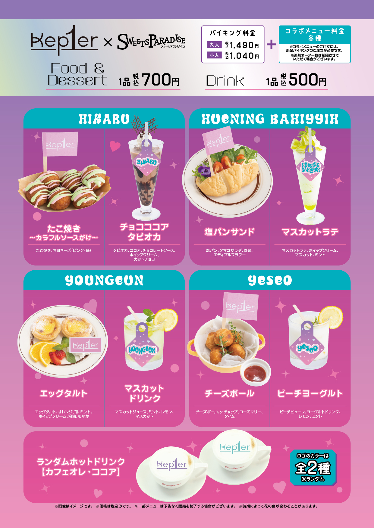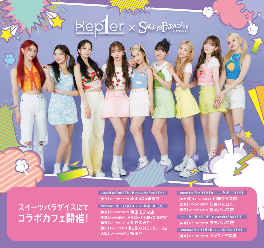 Kep1erとスイーツパラダイスのコラボカフェが、2022年12月16日(金)から2023年2月15日(水)にかけて、スイーツパラダイスSoLaDo原宿店/町田モディ店/丸井大宮店/ 梅田店/名古屋スパイラルタワーズ店/福岡パルコ店/広島パルコ店/仙台パルコ店など全国11店舗で順次開催されることが決定した。