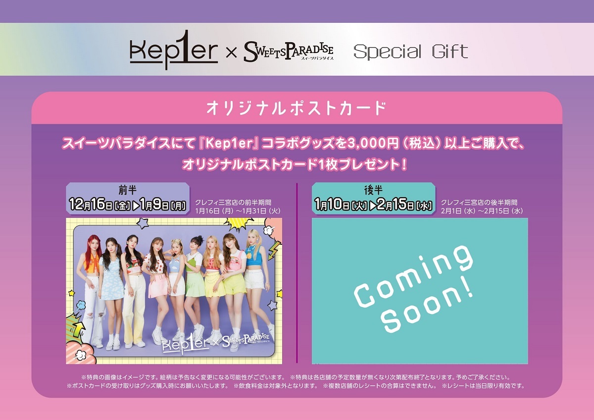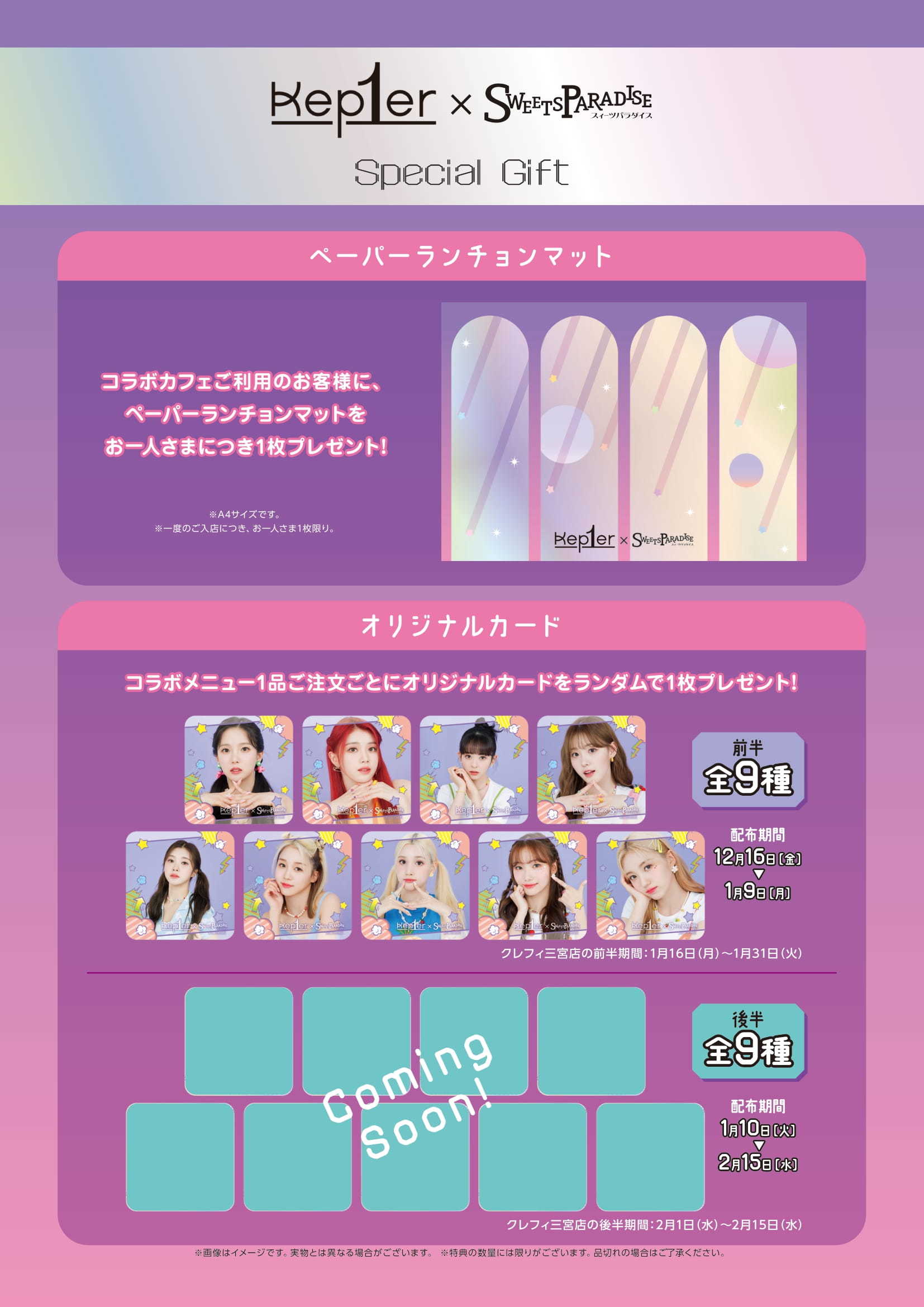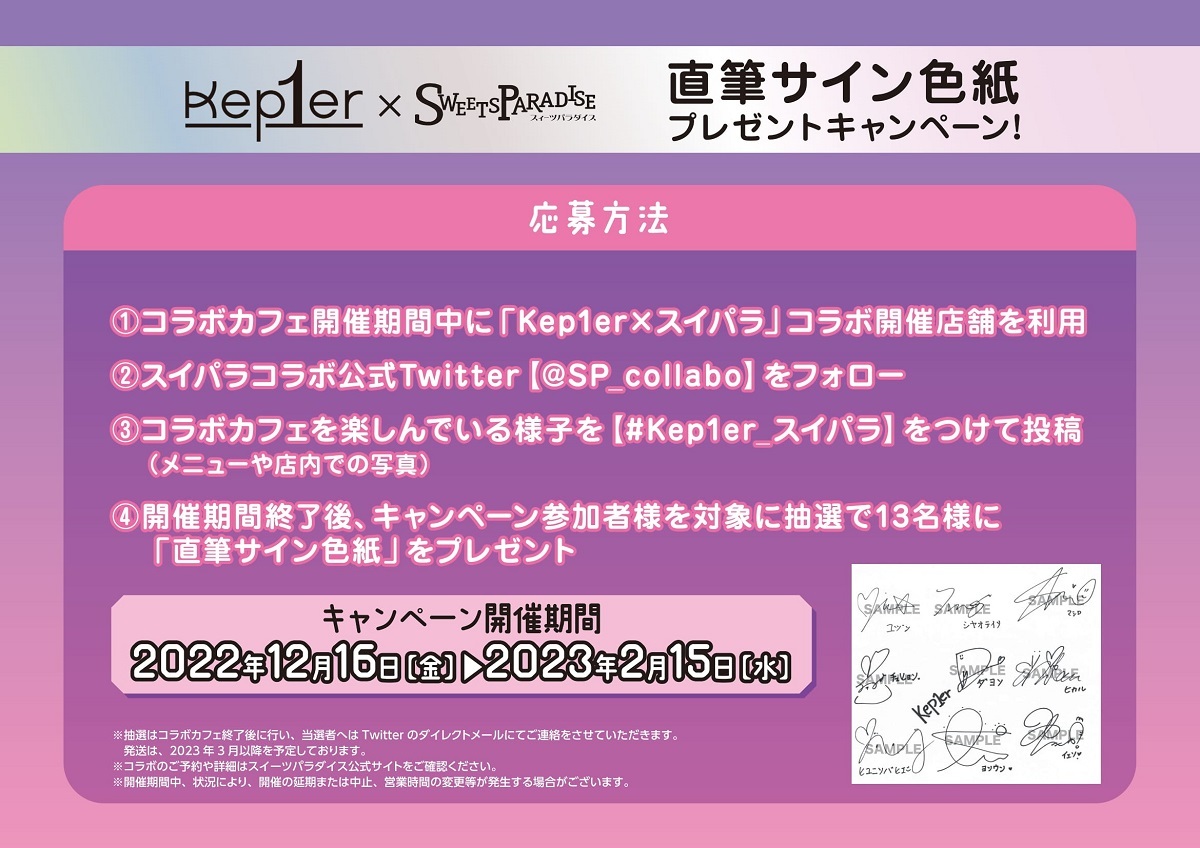 Kep1erとスイーツパラダイスのコラボカフェが、2022年12月16日(金)から2023年2月15日(水)にかけて、スイーツパラダイスSoLaDo原宿店/町田モディ店/丸井大宮店/ 梅田店/名古屋スパイラルタワーズ店/福岡パルコ店/広島パルコ店/仙台パルコ店など全国11店舗で順次開催されることが決定した。