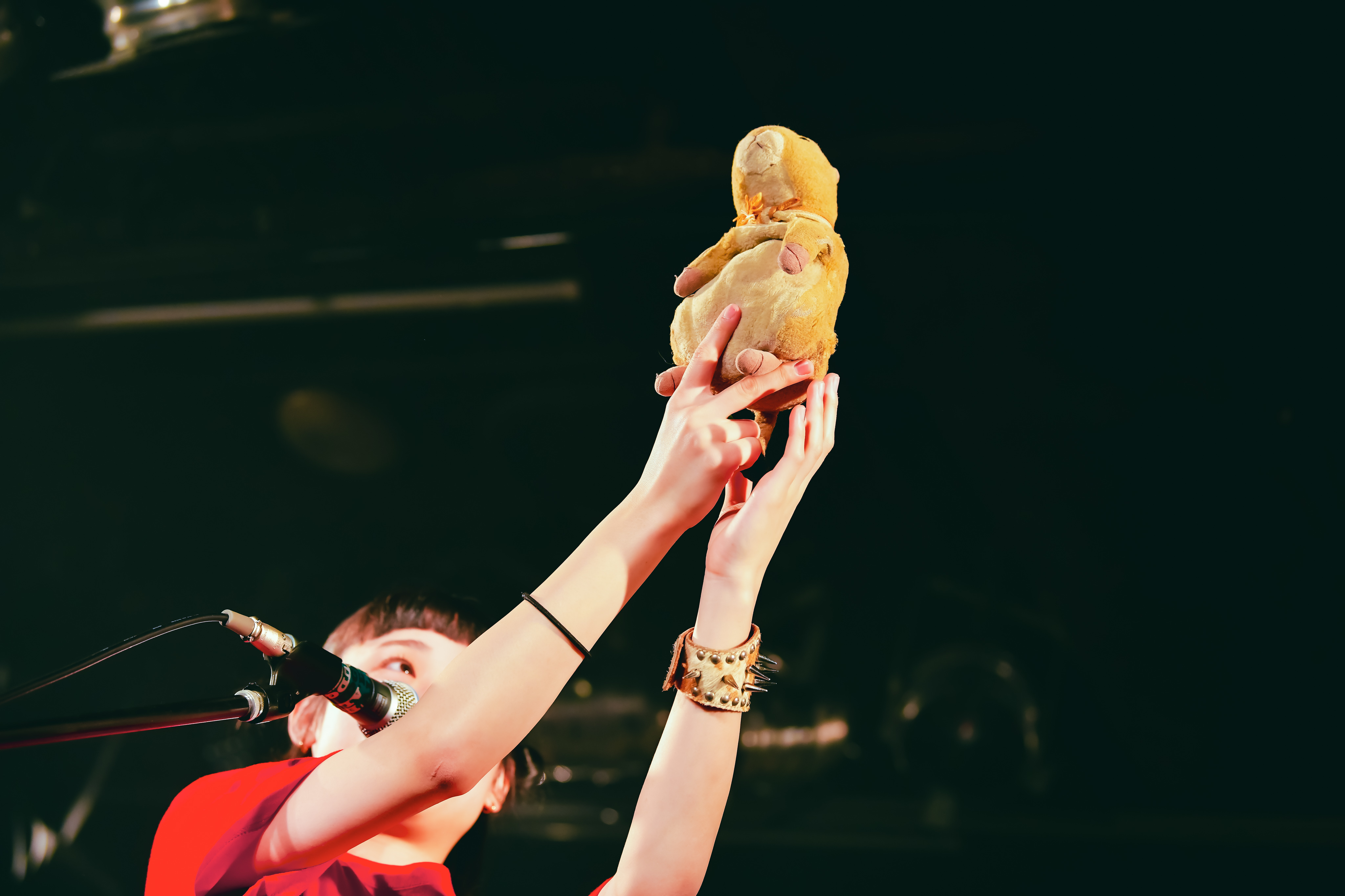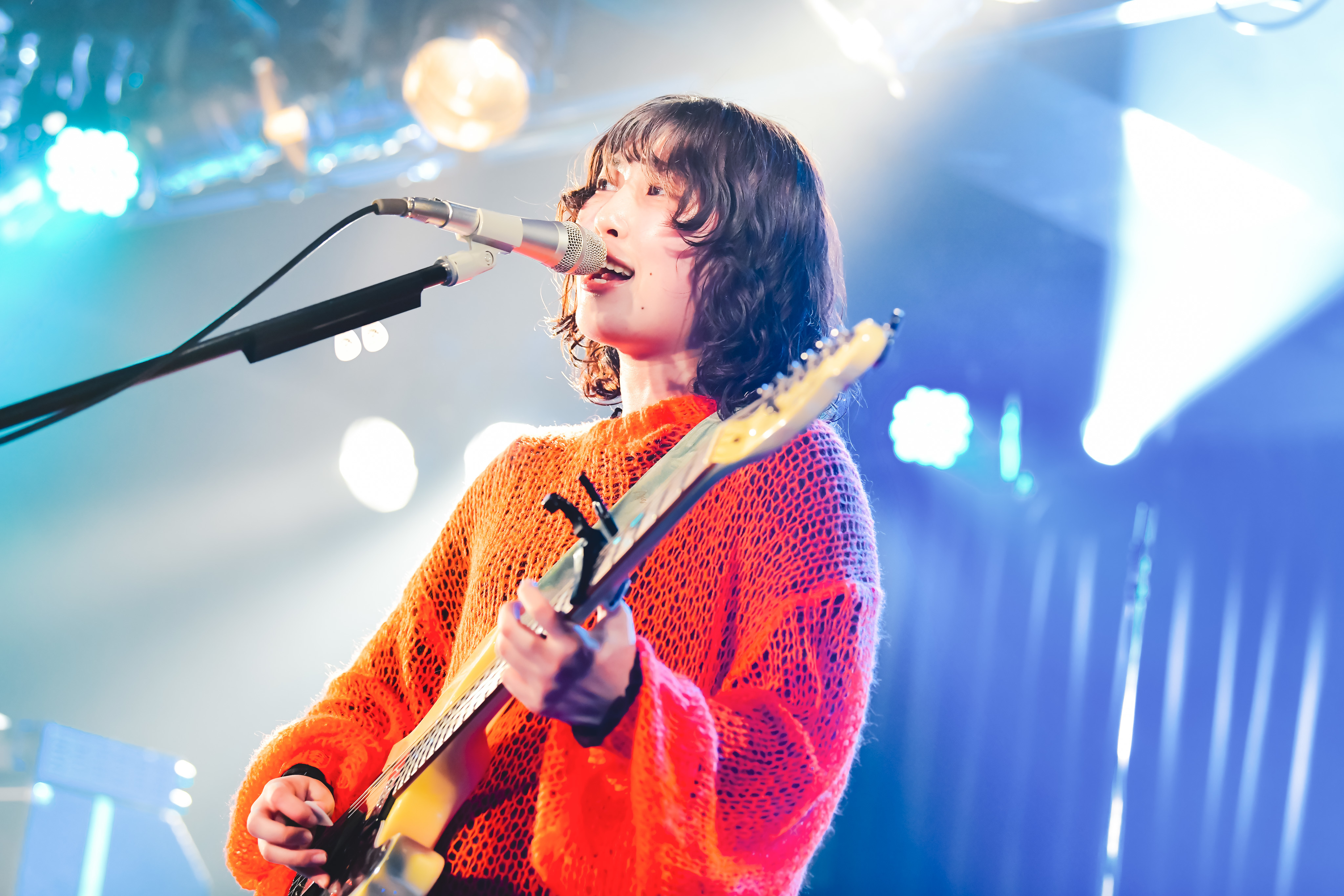 続いて今年3月にリリースされた1stミニアルバムのタイトルソング「ふたりのせい」を披露。少し切なく、深さも感じられるグッドメロディが耳を喜ばせる。さすが『ざわめきプレイリスト』だ。楽曲の余韻に浸っていると、にわかにステージがざわついた。梅林寺のギターの弦が切れてしまったのだ(実は最初から切れていたらしい)。一度袖に引っ込み、カネヨリマサルからギターを借りてきた梅林寺。ピンクのストラップとボディにあしらわれた花柄がとてもキュートで、客席からは思わず歓声が上がった。こんなレアな姿を見られるのもライブならでは。ギターを持ち替えた後半は、「一番大事な曲」と紹介した「東京」を弾き語りからしっとりと聴かせる。と思いきや今度は一転して、最強にパワフルなドラムが叩き込まれ、弾けるように明るいサウンドの「新曲(タイトル未定)」へ。梅林寺の歌声と貴志のコーラスによるハーモニーが美しい。<I love you!>と叫ぶ姿に客席は手を挙げて応える。