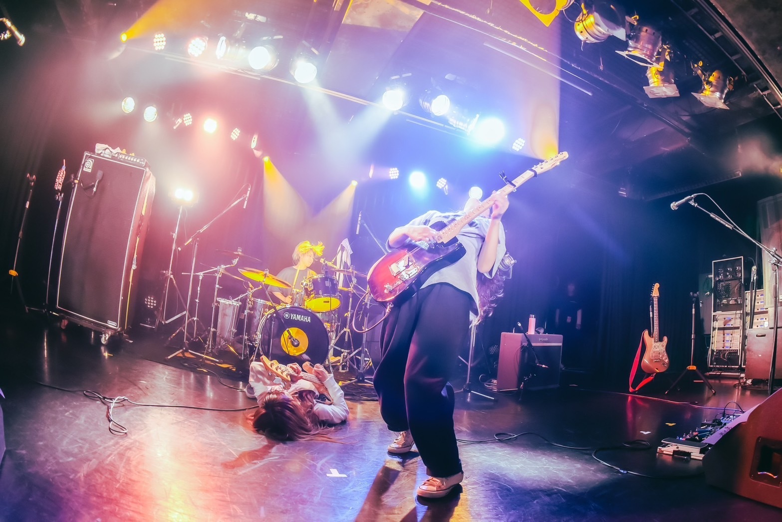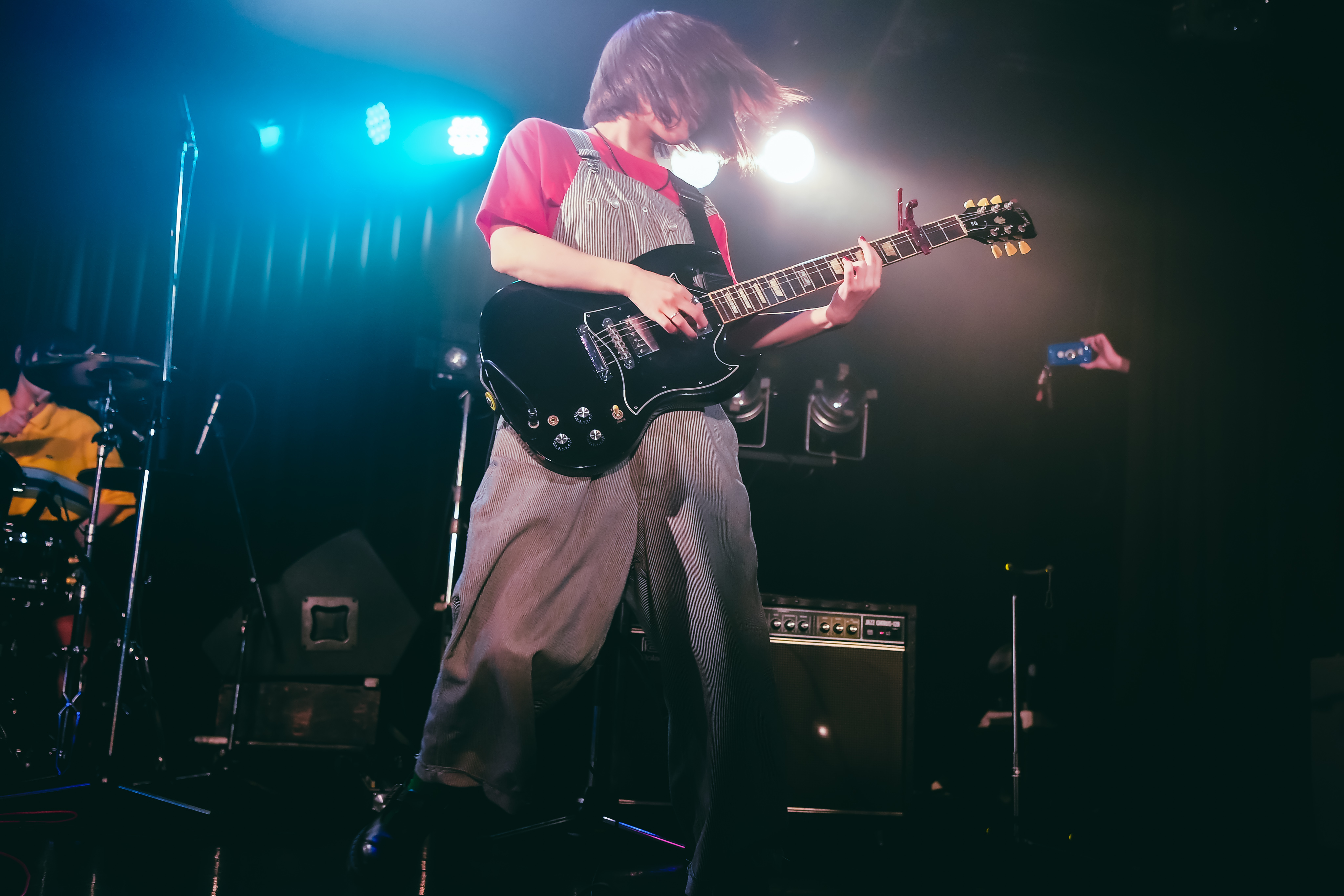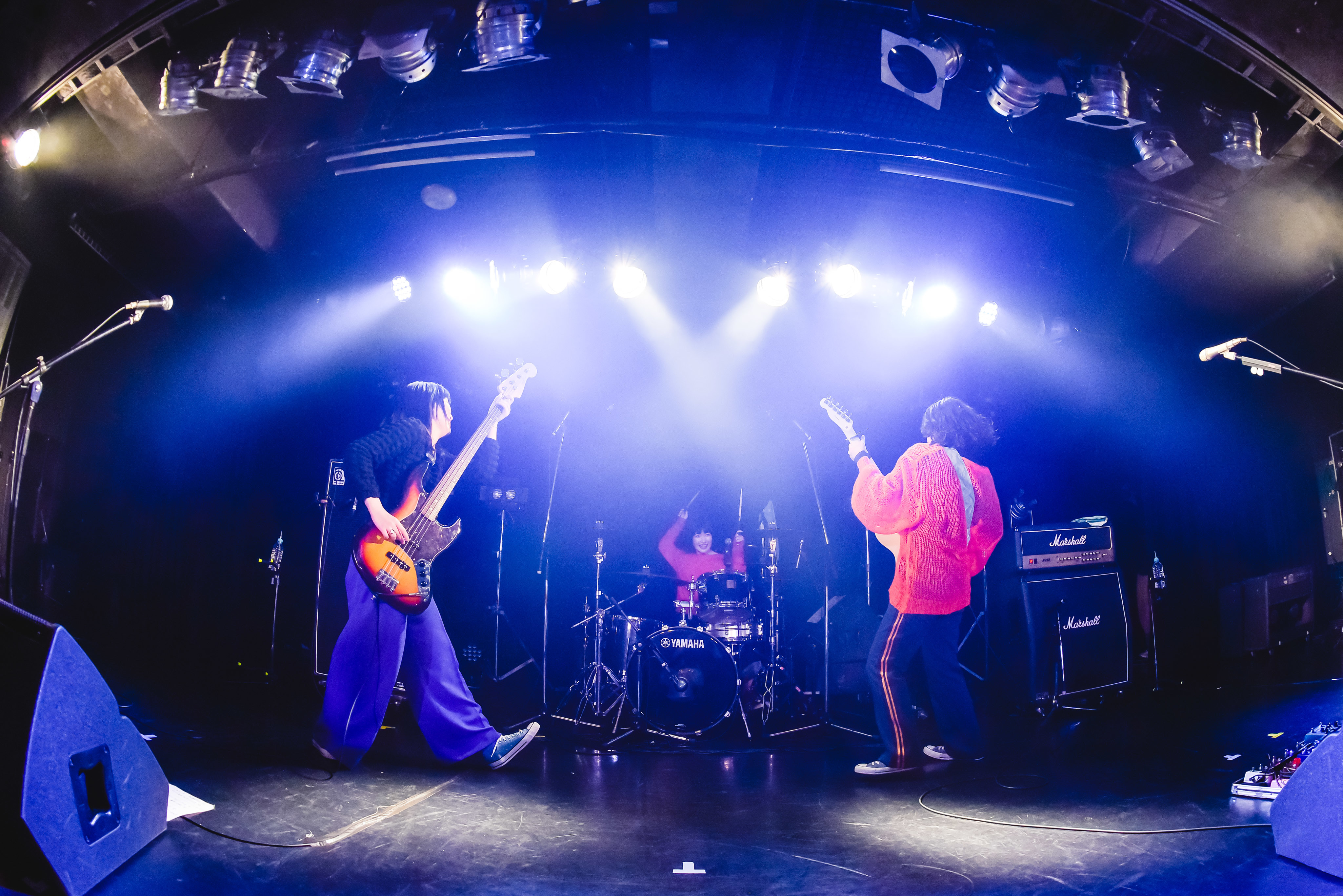 なち(Vo.Gt)が「よろしくお願いしまーす!」と叫び、「ナイスなガール」を披露。ハッキリとしたなちの歌声と、ごうけ(Dr.Cho)とサポートのサトウが支える堅実なサウンドが会場に響き渡る。1曲目から演奏力の高さが感じられるのはさすがだ。歌謡曲の要素を含む「スケボー泥棒!」は、スケボーが盗まれたことをキッカケに作ったそうだ。続いて披露された「生活」でも、<洗濯と部屋の音><明日早起きをしよう 明日パンを食べよう 花に水をあげよう>と歌われるように、本当に何でもない日々の出来事を楽曲に閉じ込めるセンスが素晴らしい。親しみやすいメロディとサウンド、素直な歌声は老若男女に受け入れられるだろうと感じた。