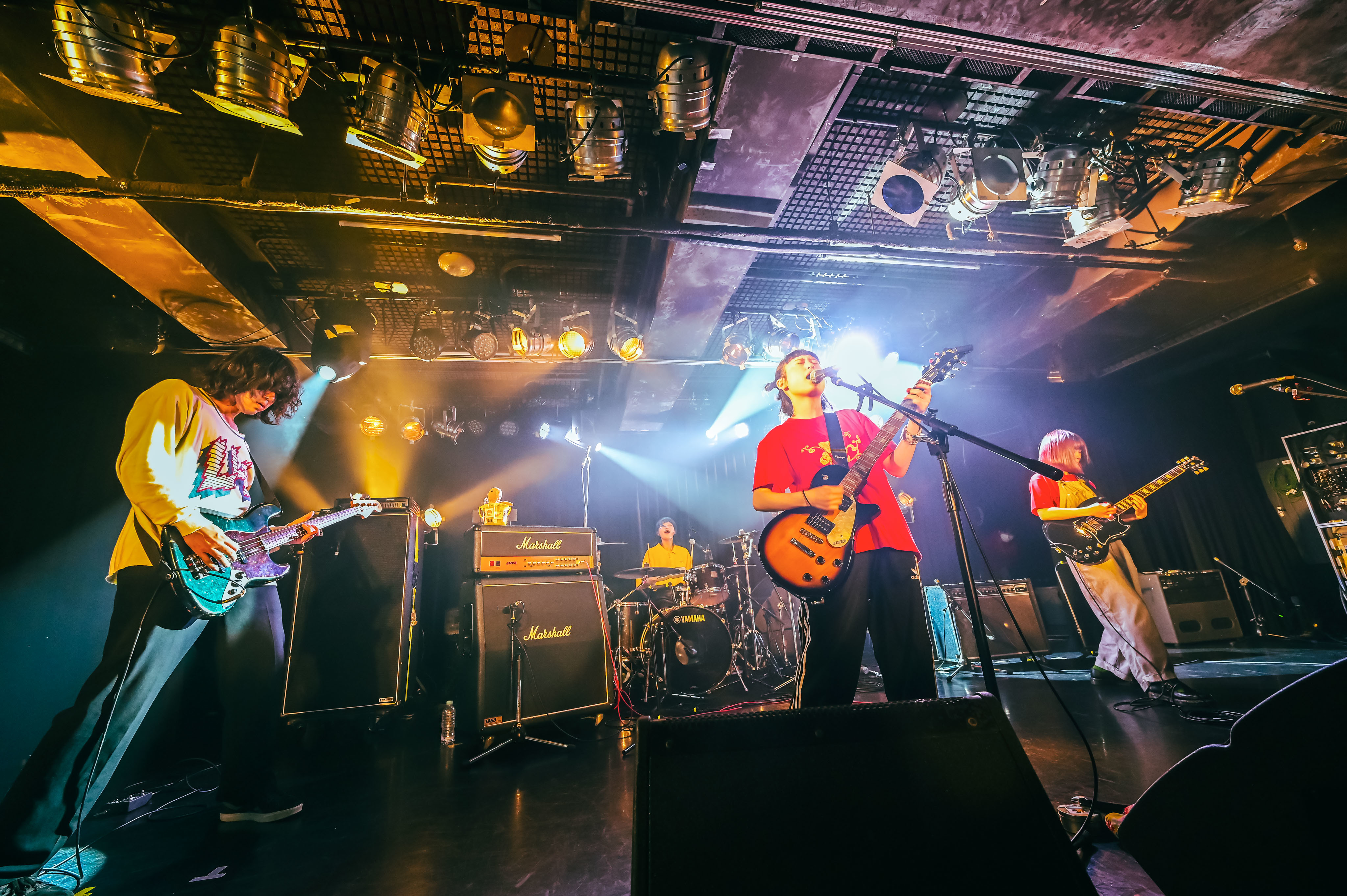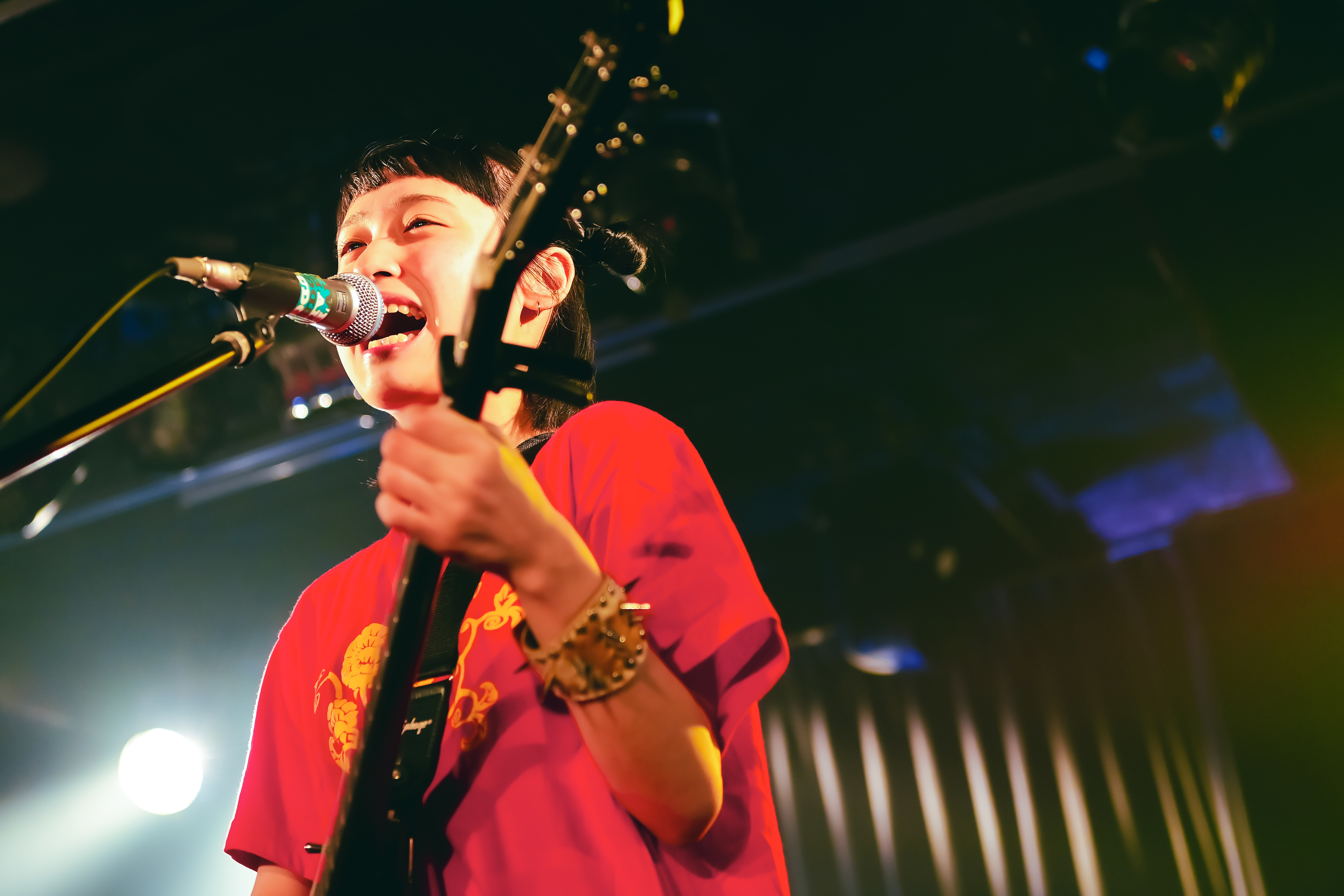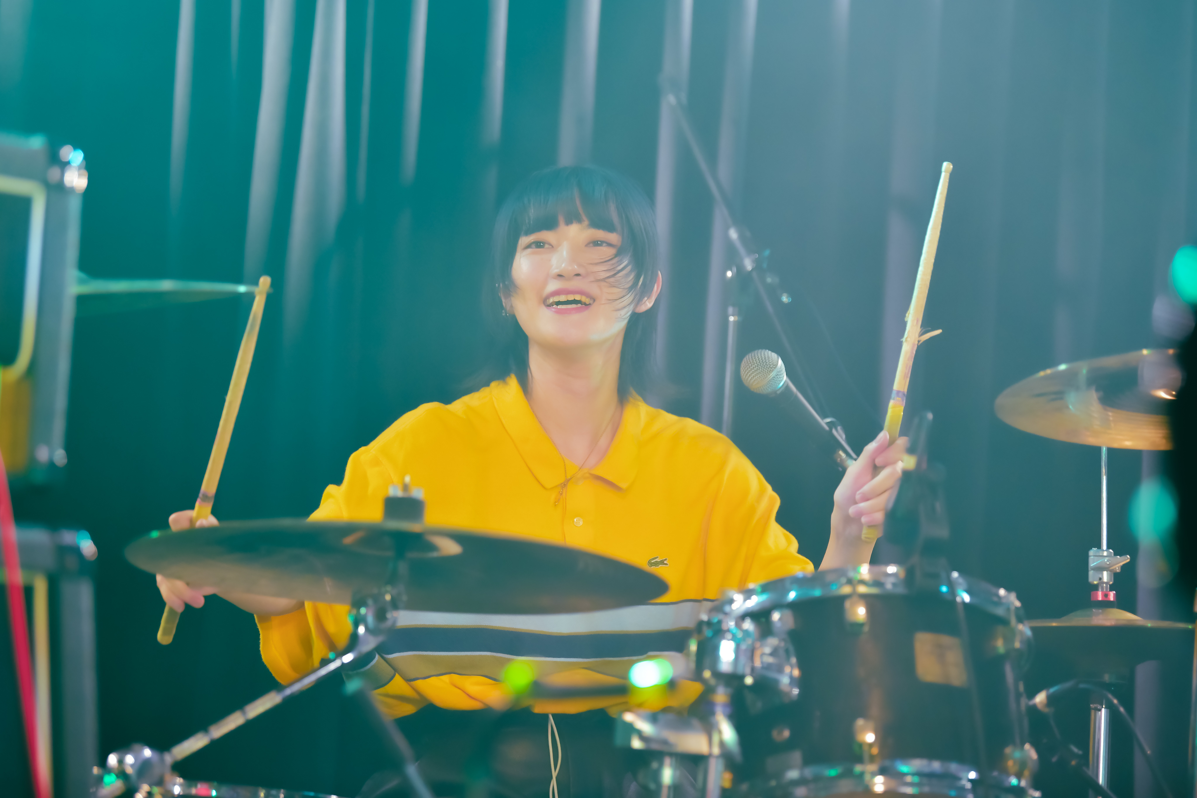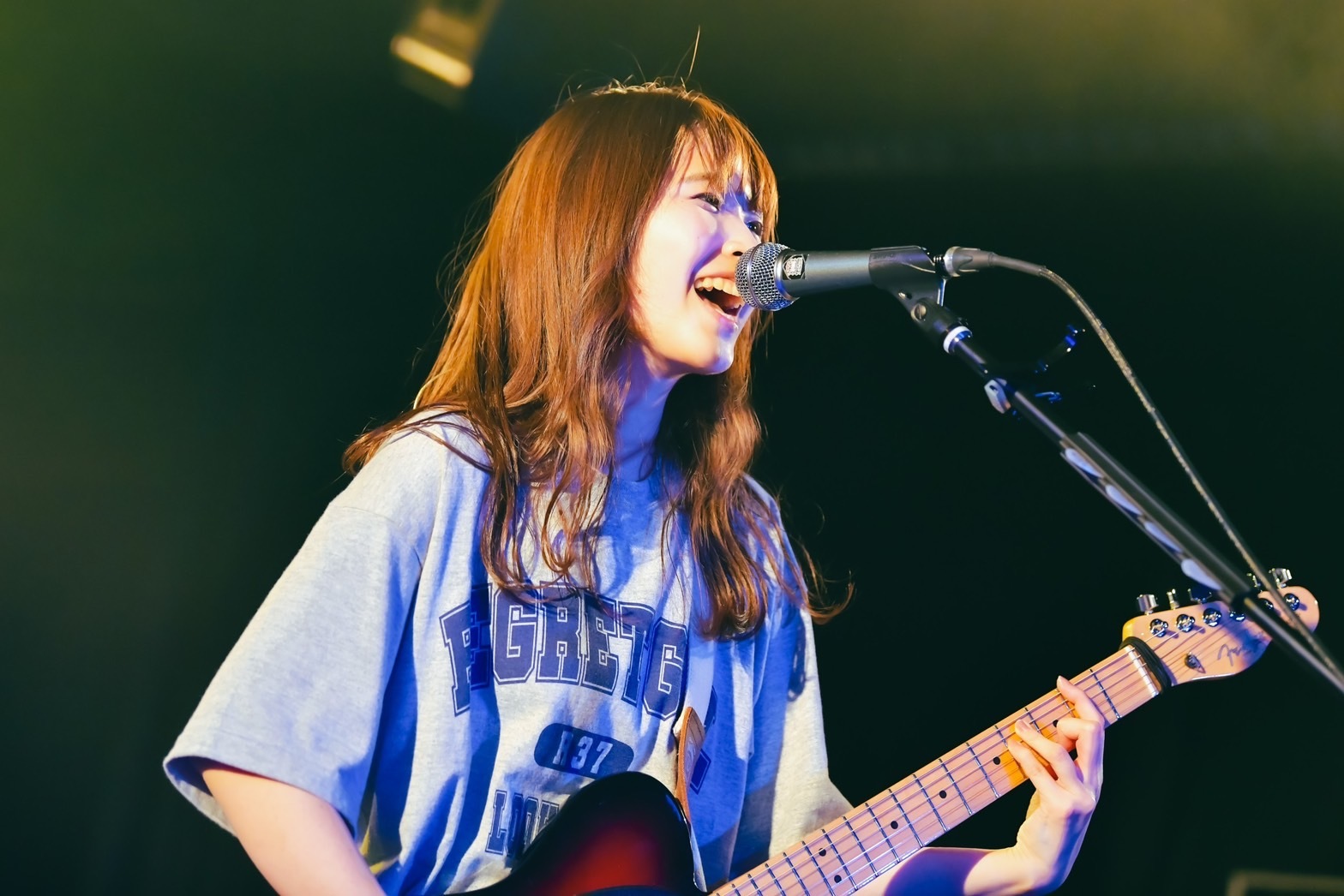 なち(Vo.Gt)が「よろしくお願いしまーす!」と叫び、「ナイスなガール」を披露。ハッキリとしたなちの歌声と、ごうけ(Dr.Cho)とサポートのサトウが支える堅実なサウンドが会場に響き渡る。1曲目から演奏力の高さが感じられるのはさすがだ。歌謡曲の要素を含む「スケボー泥棒!」は、スケボーが盗まれたことをキッカケに作ったそうだ。続いて披露された「生活」でも、<洗濯と部屋の音><明日早起きをしよう 明日パンを食べよう 花に水をあげよう>と歌われるように、本当に何でもない日々の出来事を楽曲に閉じ込めるセンスが素晴らしい。親しみやすいメロディとサウンド、素直な歌声は老若男女に受け入れられるだろうと感じた。
