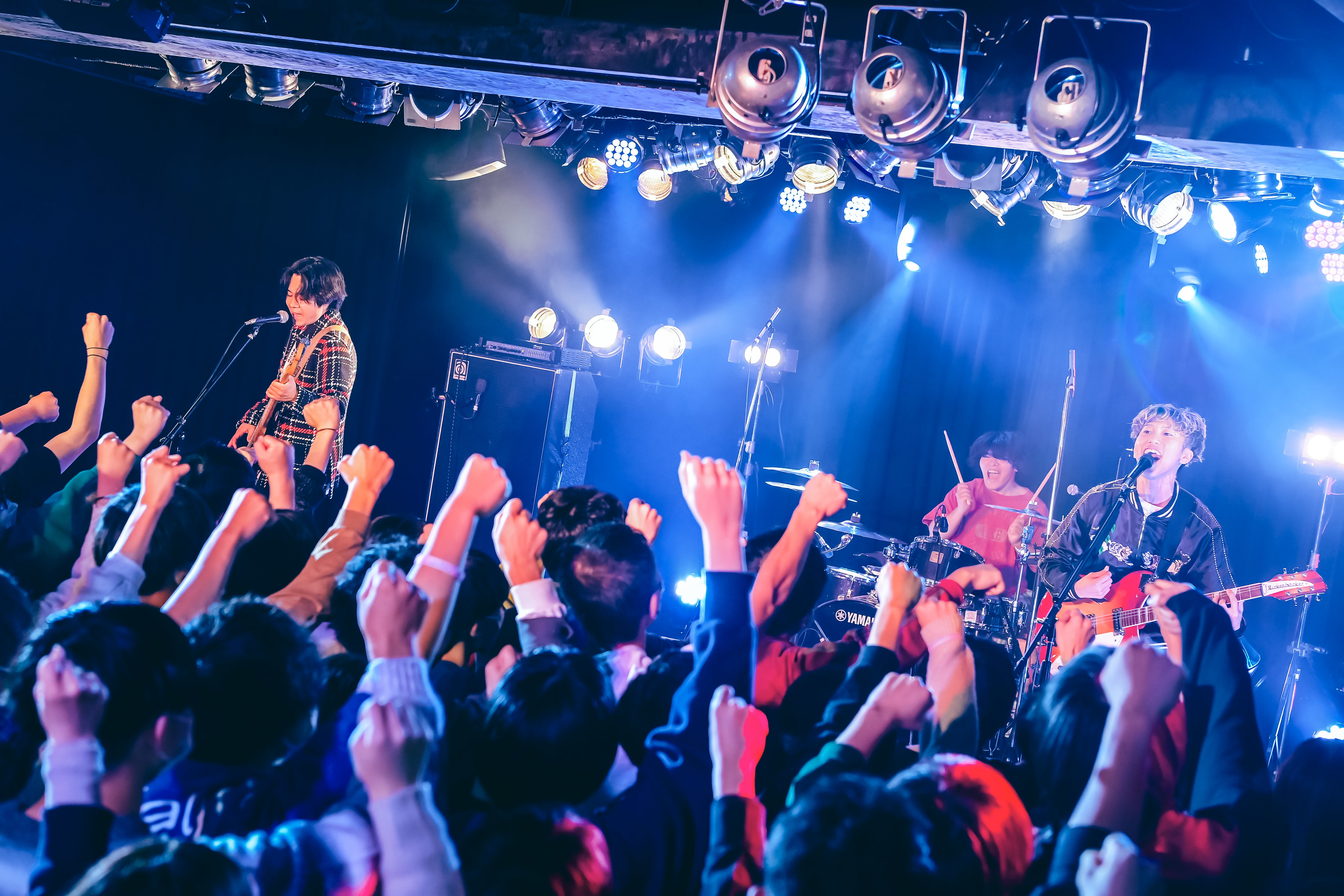 そして「ロックバンドが本気出すぜ! ついてこいや! 暴れようぜ!!」と、高速ビートでさらに加速。「cry cry cry」をものすごいスピードでプレイ。「今日一番の暴れ具合、見せてくれ!」と煽る。言わずもがなその熱量に引っ張られてフロアはお祭り騒ぎ。「まだあるぜ」とラストは「グッバイガール」を軽快かつ激しくドロップ! <伝えよう俺らの思いを!>と叫び、元気でポップで若さ溢れる眩しいライブで魅了した。生だからこそのトラブルを物ともせず、彼ららしく駆け抜けたフレッシュな時間だった。