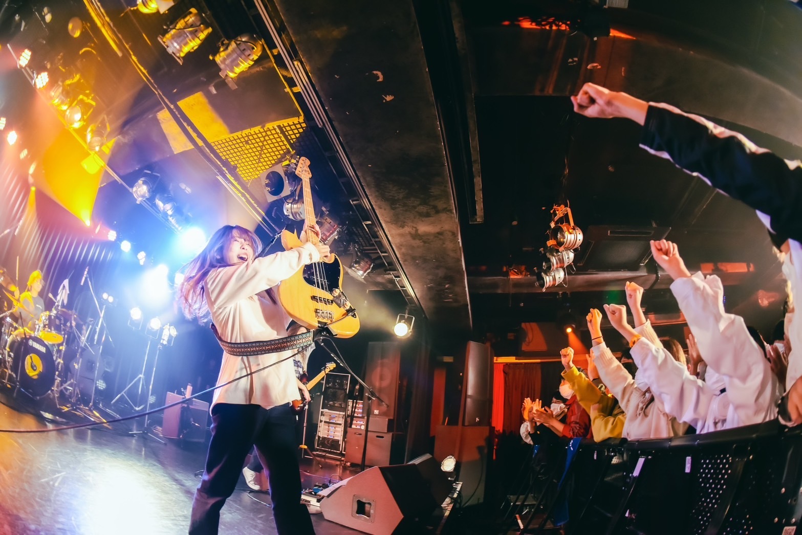 ちとせはMCで「初めてお客さんとしてライブハウスに観に行ったのがジャニスで、ずっと昔から大切な場所で、今日も思い出が増えていくことがほんまに嬉しいし、「久しぶり!」と戻ってこれるイベントがあってステージがあって、久しぶりと初めましてが混ざったあったかいみんながいて。今日、忘れたくないです。バンドやってて良かったなと思いました」と感謝を伝えて、叫ぶように「音楽の中に気持ちってもんを込めたら、パワーアップすること私は知ってます。みんなに気持ちがこもった音楽を渡します。みんなの心をざわざわさせたいです!」と情熱を込めて「南十字星」を届ける。会場からは自然にクラップが発生。ラストに向けてエモーショナルに高まったところに間髪入れず「ガールズユースとディサポイントメント」を投下した。「ライブハウスを選んでくれてありがとうね! 信じてくれてありがとうね! いつでもここにおるからね!」と想いを伝え、激しさを増して全力で駆け抜ける。
