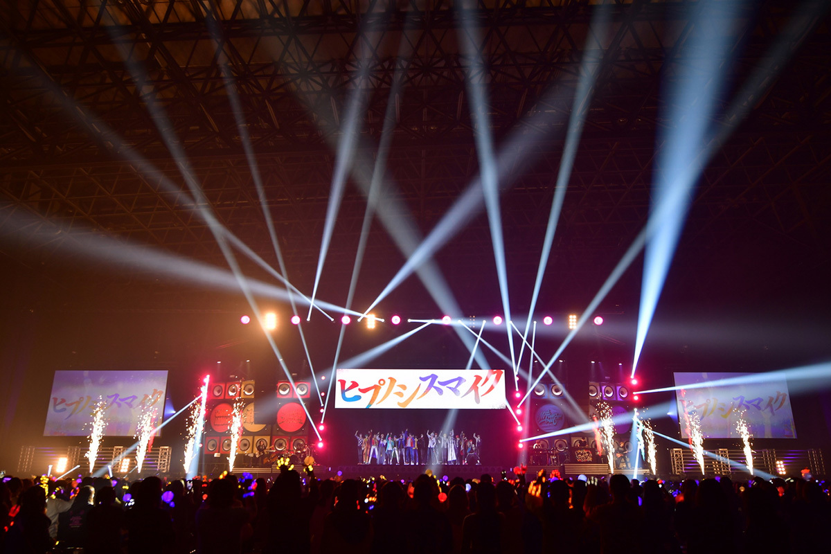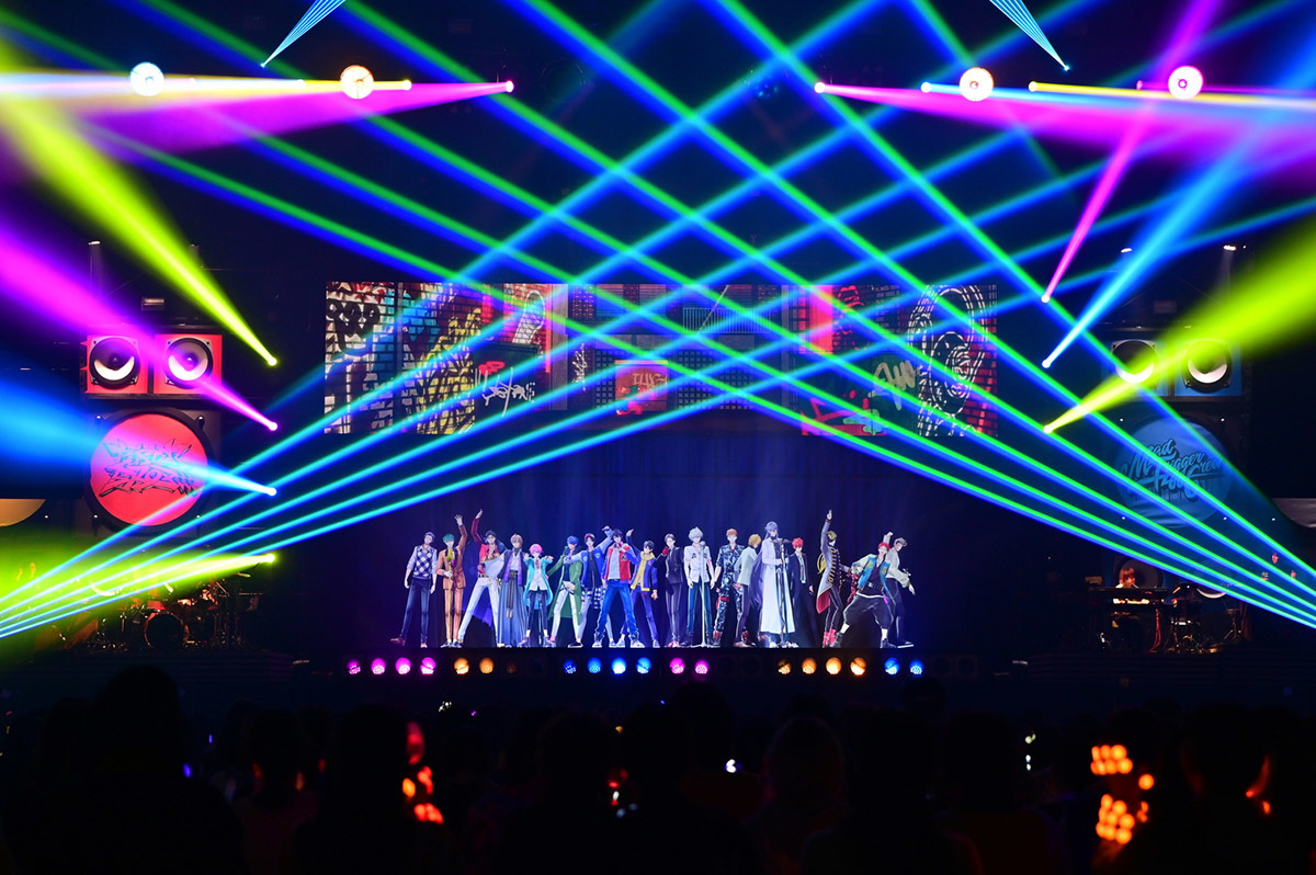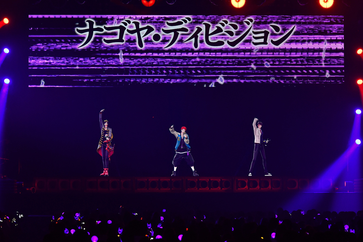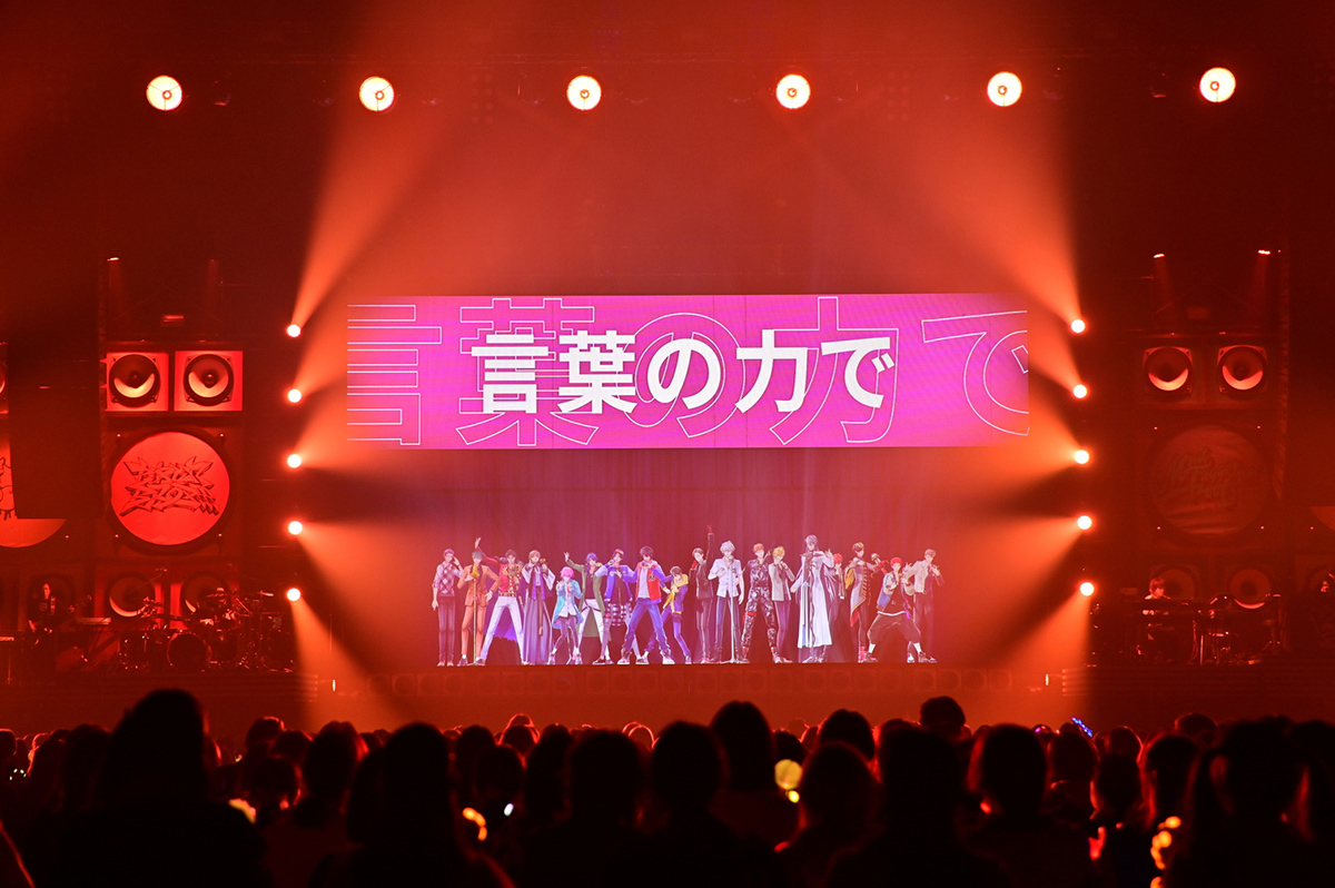 再びライブは各ディビジョン曲へ。オオサカは“笑オオサカ! ~What a OSAKA!”、ナゴヤは“開眼”、シンジュクは“パピヨン”を披露。続くシブヤは、6ディビジョンがバトルを展開した「Division Rap Battle- 2nd D.R.B」の優勝記念としてKREVAが制作した「キズアトがキズナとなる」をパフォーマンスし、王者としての存在感を形にする。そしてシンジュクは「シノギ(Dead Pools)」、イケブクロは「おはようイケブクロ」と、各ディビジョンの特色が落とし込まれた楽曲を展開した。