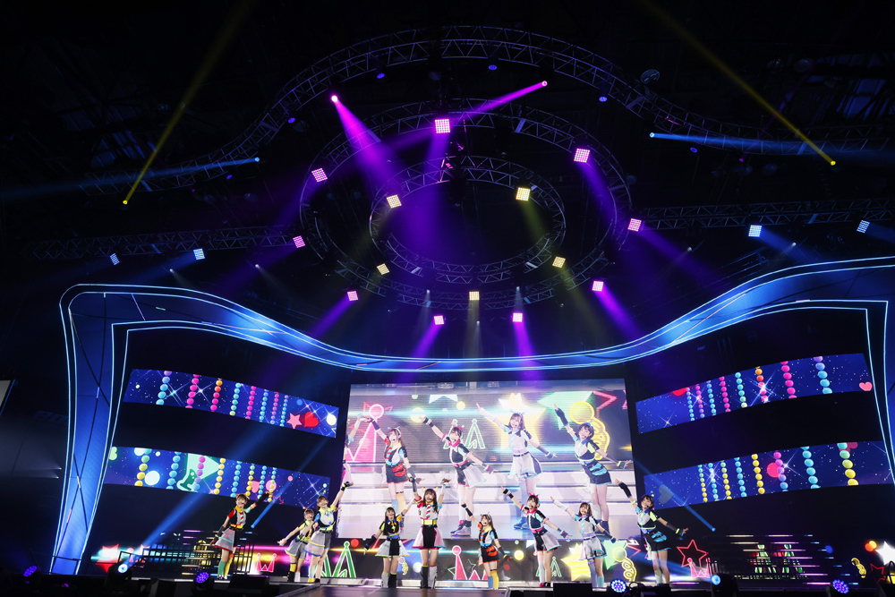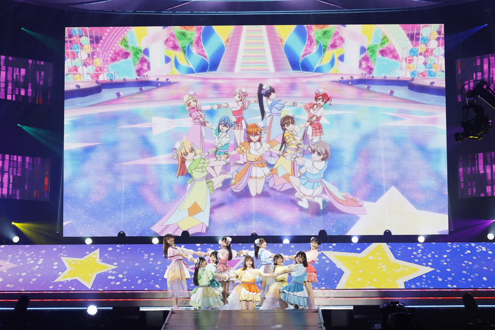 そして9人そろってのカウントダウンから、再びリアルのステージへ…唄う曲はアニメでは学園祭で披露したダンスナンバー「ビタミンSUMMER!」だ。ゲームキャラのようなポップなコスチュームに身を包んだ9人が勢ぞろいし、蛍光カラーが輝くライティング演出を交えながらのシンクロパフォーマンスとキレのあるダンスで場内を盛り上げた。