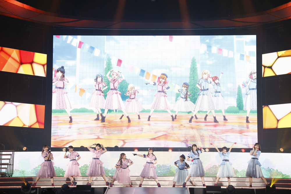 再びスクリーンにはTVアニメのダイジェストが映し出される。互いを思いやるが故にスクールアイドル部への入部に踏み切れなかった米女メイと若菜四季を描いた第4話では、四季の照れ顔や想いを確かめあうように手を繋ぐシーンではファンからの拍手が巻き起こった。そして一年生だけでの夏休み合宿や、かのんに背中を押されて鬼塚夏美がLiella!へと合流するシーンを経て、ついに9人が勢ぞろい。