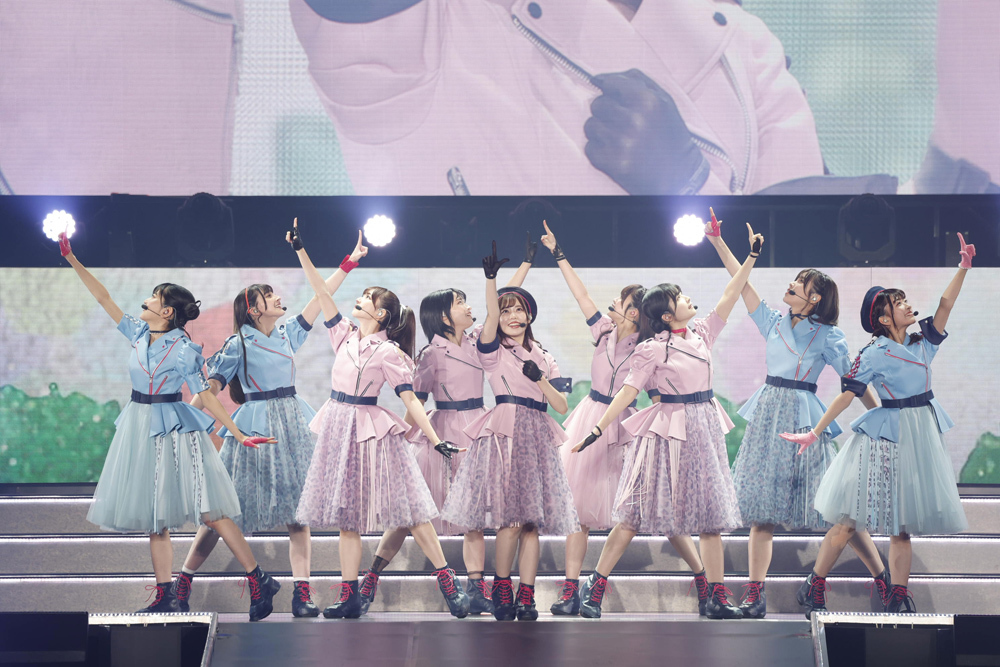 ファンの想いに応える様に始まったアンコールステージに、ライブTシャツへと着替えた9人が登場。海辺で遊ぶ9人をイメージした振り付けやパフォーマンスが盛り込まれたサマーソング「水しぶきのサイン」からスタートし、四季の合図でトロッコに乗り込みながらの二曲目「Dreaming Energy」では、シャボン玉を客席めがけて打ち込みながら明日に向かって飛び出す楽しさを熱唱。