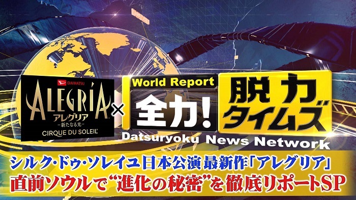 この度、12月10日(土)16時30分より「全力!脱力タイムズ」の特別編として、シルク・ドゥ・ソレイユの秘密を探る特別番組 『全力!脱力タイムズ特別編シルク・ドゥ・ソレイユ日本公演最新作『アレグリア』直前ソウルで“進化の秘密”を徹底リポート SP』 を放映することが発表された。