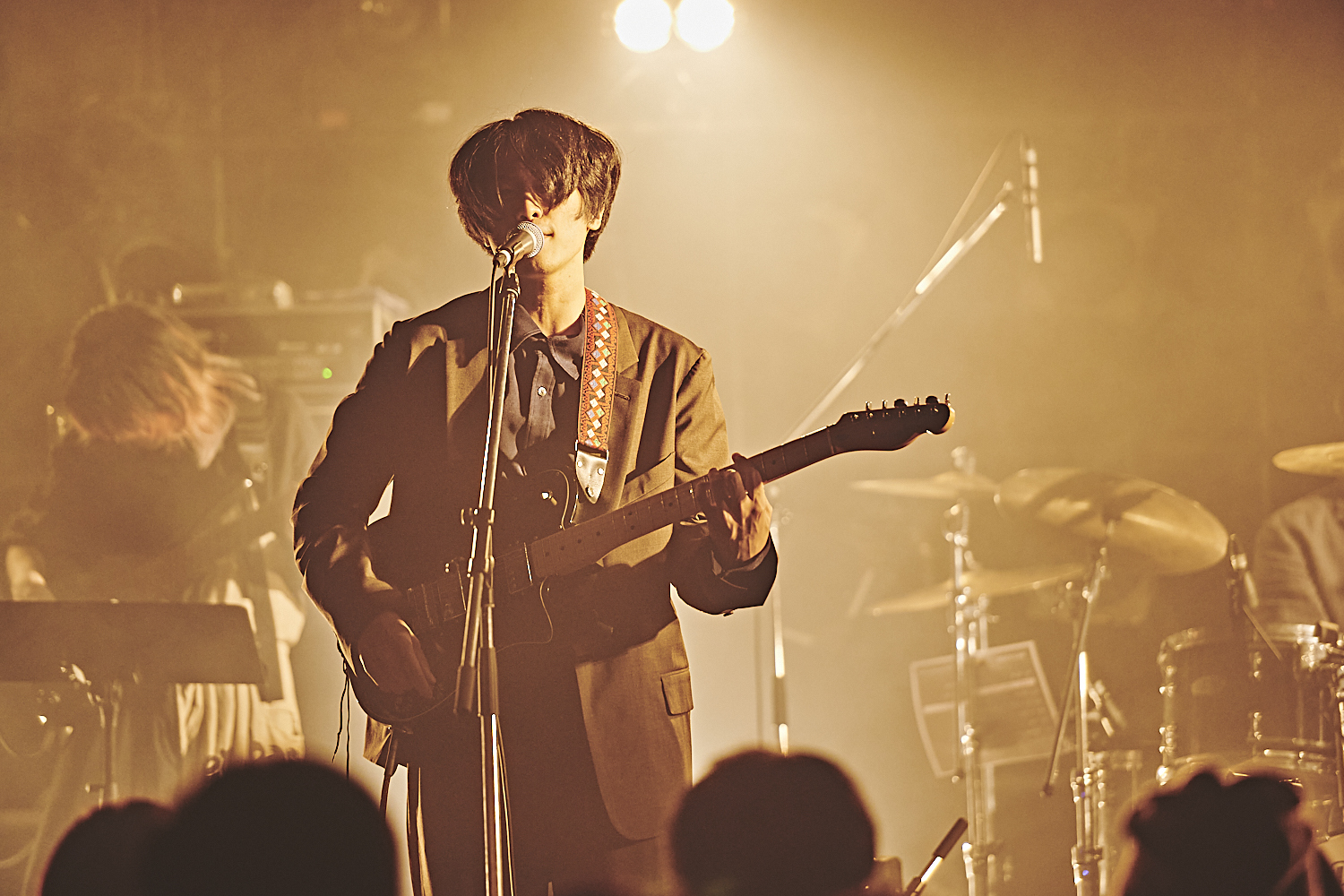 SEなしの登場からナチュラルに始まった「差し色」を皮切りに、フォーキーな歌声とやわらかなメロディが、サポートの朝田拓馬(Gt)、Yuki Atori(Ba)、小山田和正(Dr)と共に鳴らされる行き届いたバンドサウンドが、渋谷クアトロのフロアにゆっくりと染みわたっていく。
