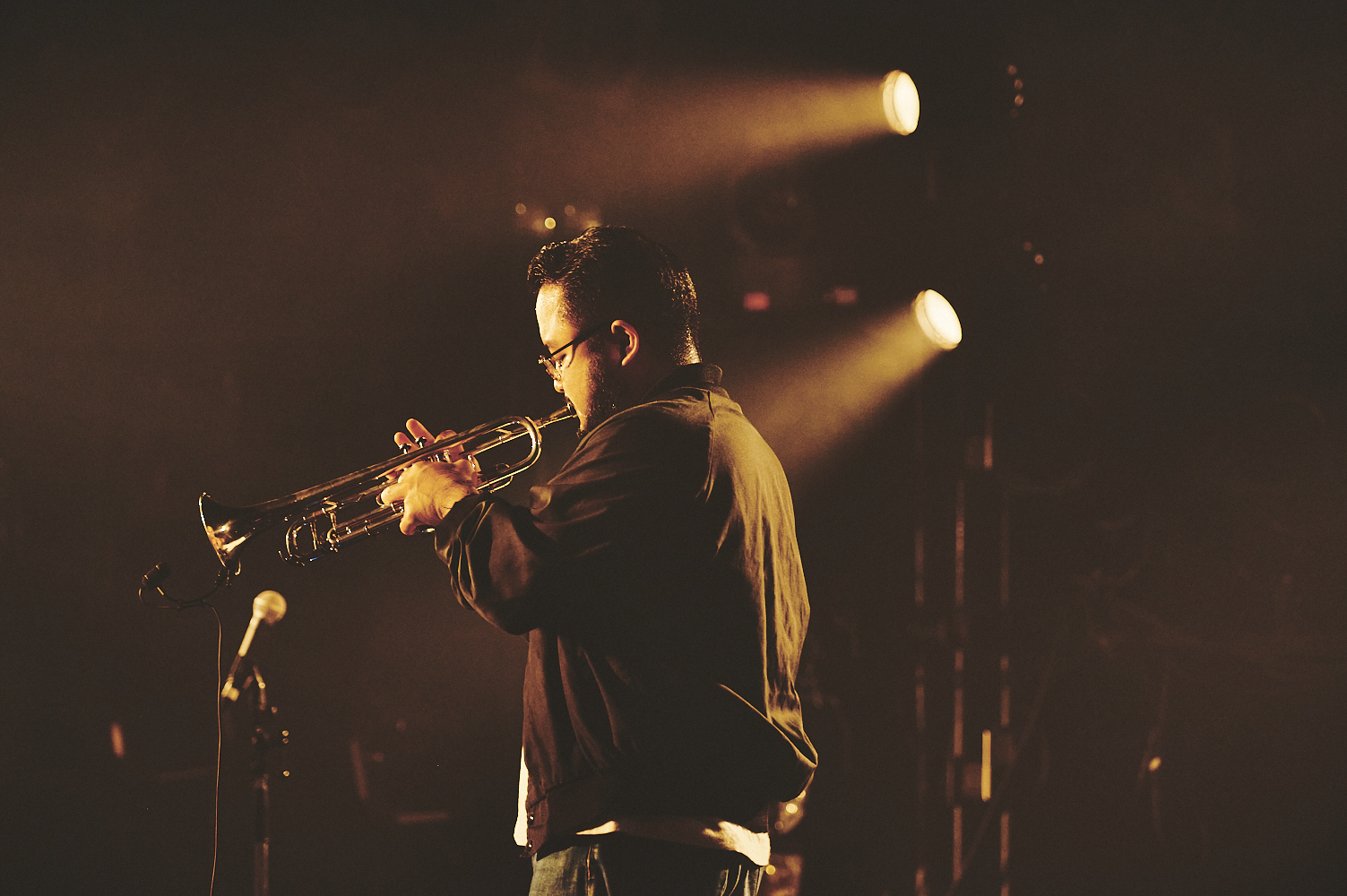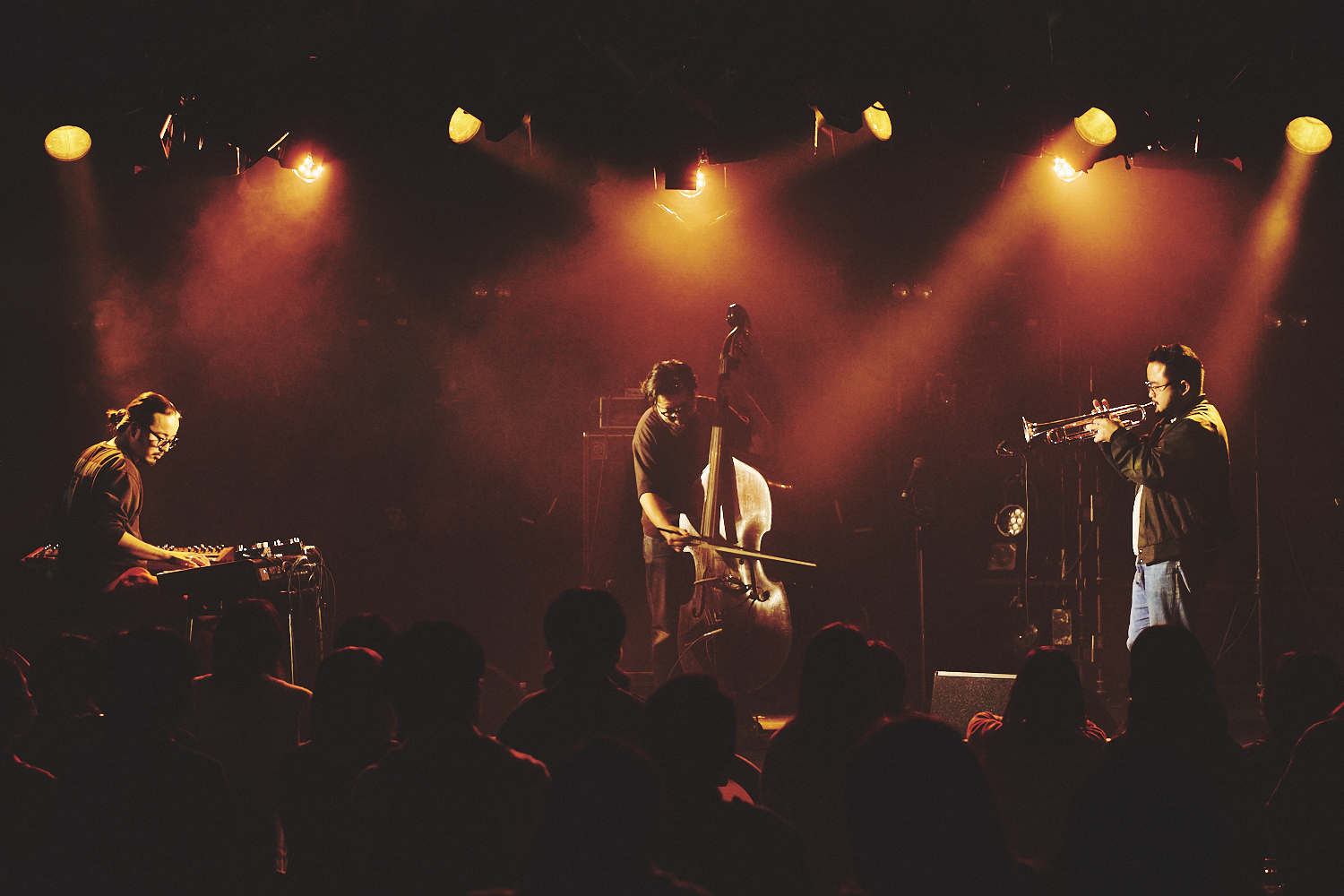 ドラムセットが片付いたスッキリとしたステージにトライアングルの陣形を取った3人は、おもむろにセッションを始め、櫻打のピアノ、佐瀬のトランペット、岩見のウッドベースが時に荘厳に、時に大らかに絡むという、独自のアンサンブルを提示。さっきまでの出演者とはまったく異なるベクトルで、こちらを新鮮な気分へと誘ってくれる。