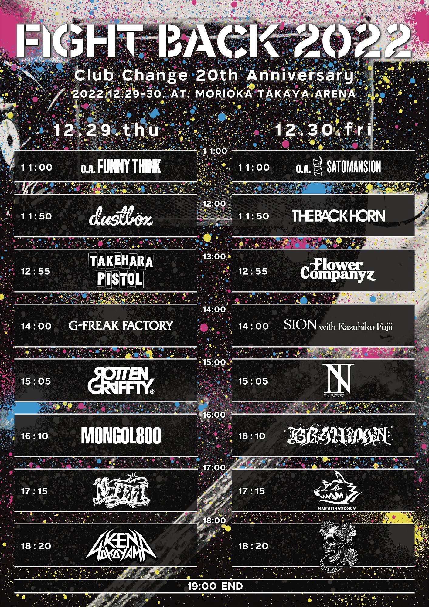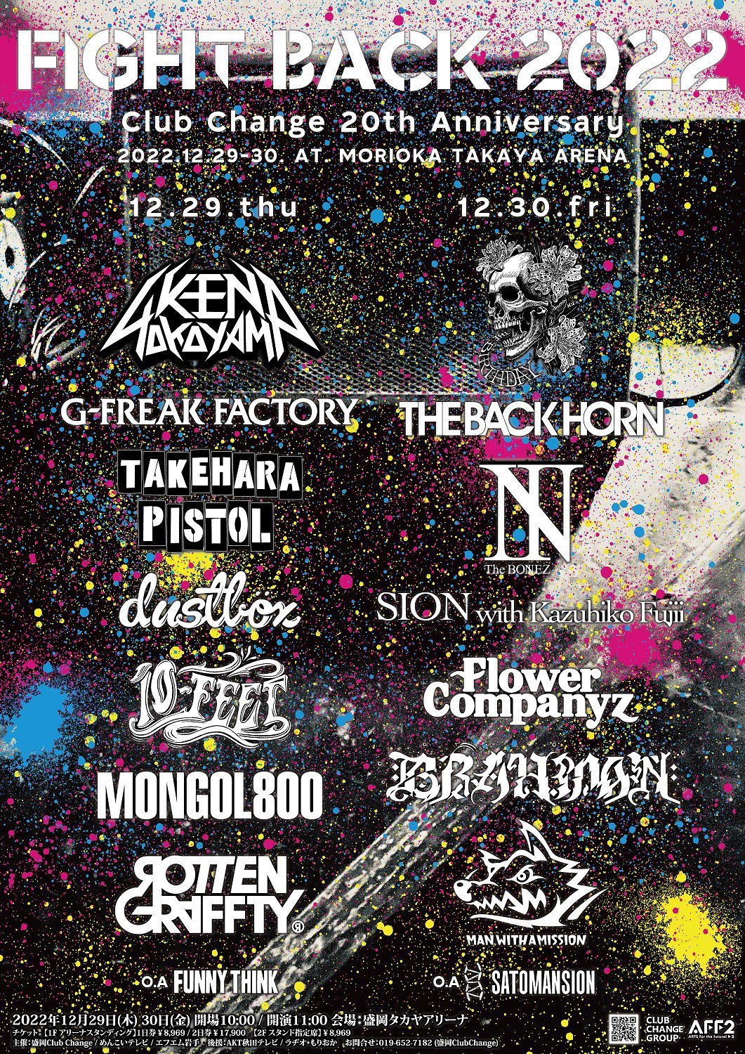 岩手県盛岡のライブハウス・Club Changeが20周年を迎えた。これを記念して、12月29日(木)・30日(金)に盛岡タカヤアリーナで『FIGHT BACK 2022 ClubChange 20th Anniversar』が開催される。29日(木)には、Ken Yokoyama、G-FREAK FACTORY、竹原ピストル、dustbox、10-FEET、MONGOL800、ROTTENGRAFFTY、(OA)FUNNY THINK。30日(金)がThe Birthday、THE BACK HORN、The BONEZ、SION with Kazuhiko Fujii、フラワーカンパニーズ、BRAHMAN、MAN WITH A MISSION、(OA)SATOMANSIONが出演……と、錚々たる顔ぶれ。