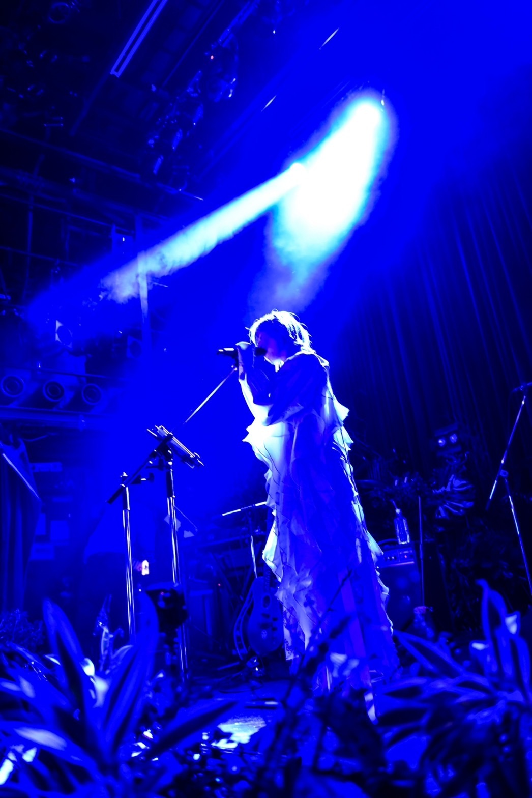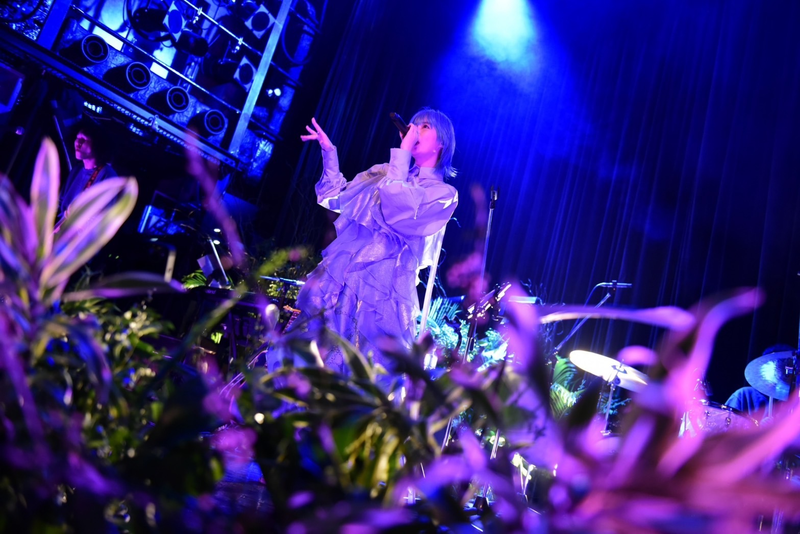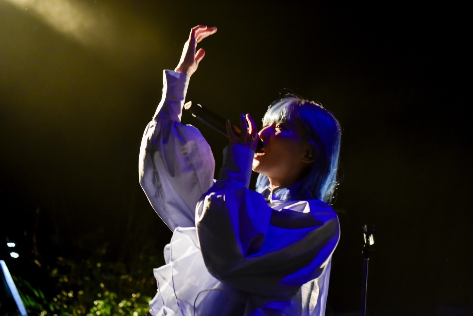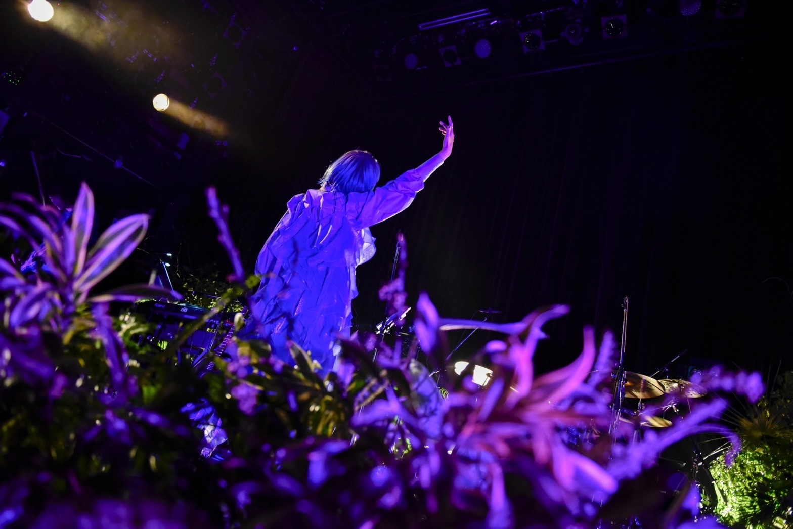 バンドセットと、たくさんの植物が置かれた緑溢れるステージに現れたPiiは、ふわりと風になびくような青いワンピースを纏って登場したのだが、その様子はまるで、凛と咲き誇る花のよう。思わずため息が出てしまいようになるくらいの美しさを体現した彼女が大きく息を吸い、歌い出したのは「花明り」。花が散る、誰かとの別れ、季節の境目。そういった「ひとつの終焉」から薫る切なさや侘しさを、叙情性のある言葉を連ねることで表現した和を尊ぶ楽曲を、じっくりと、それでいて柔らかに歌い上げていく。テーマとなっている花が持つ盛者必衰の生き様と、風に舞い散った時の花吹雪を想起させ、幻想的な世界観をぐっと色濃くさせている。