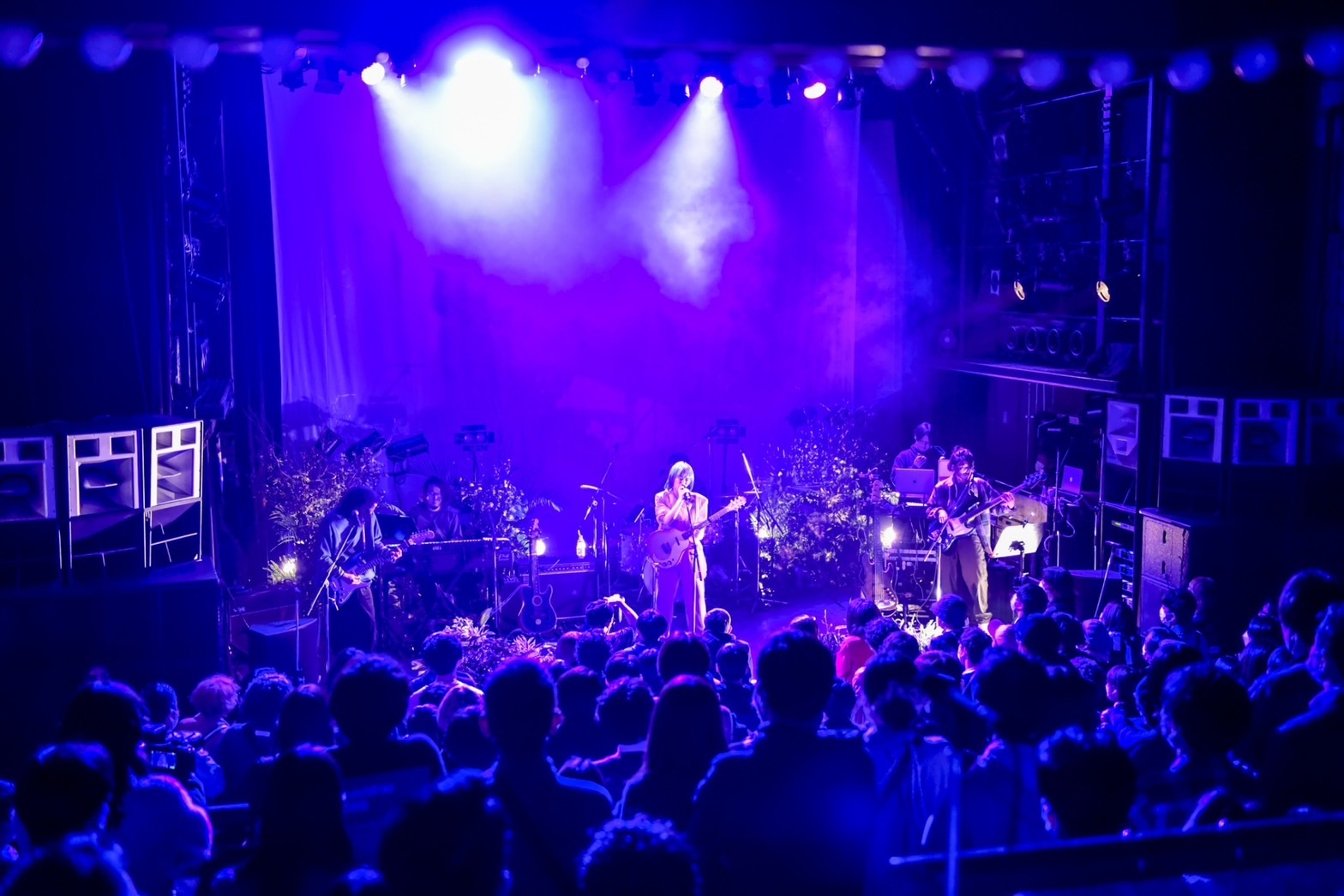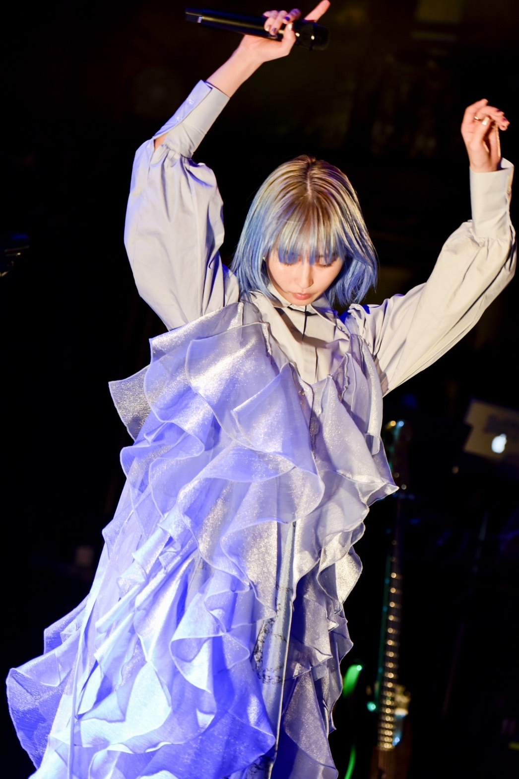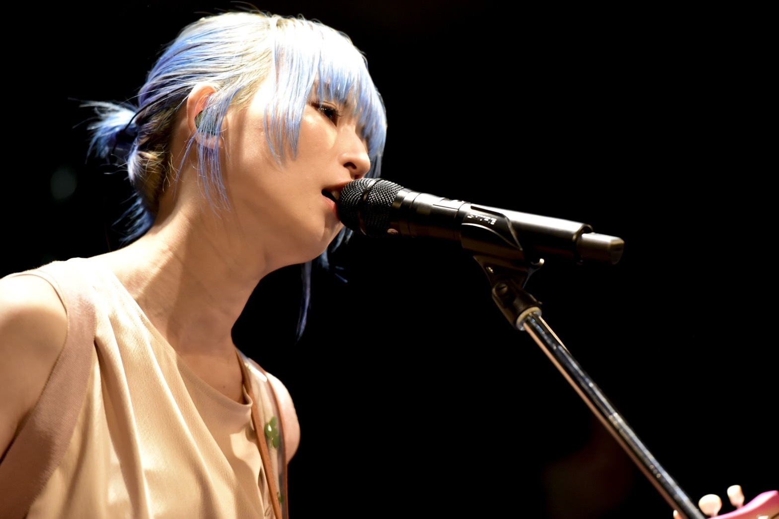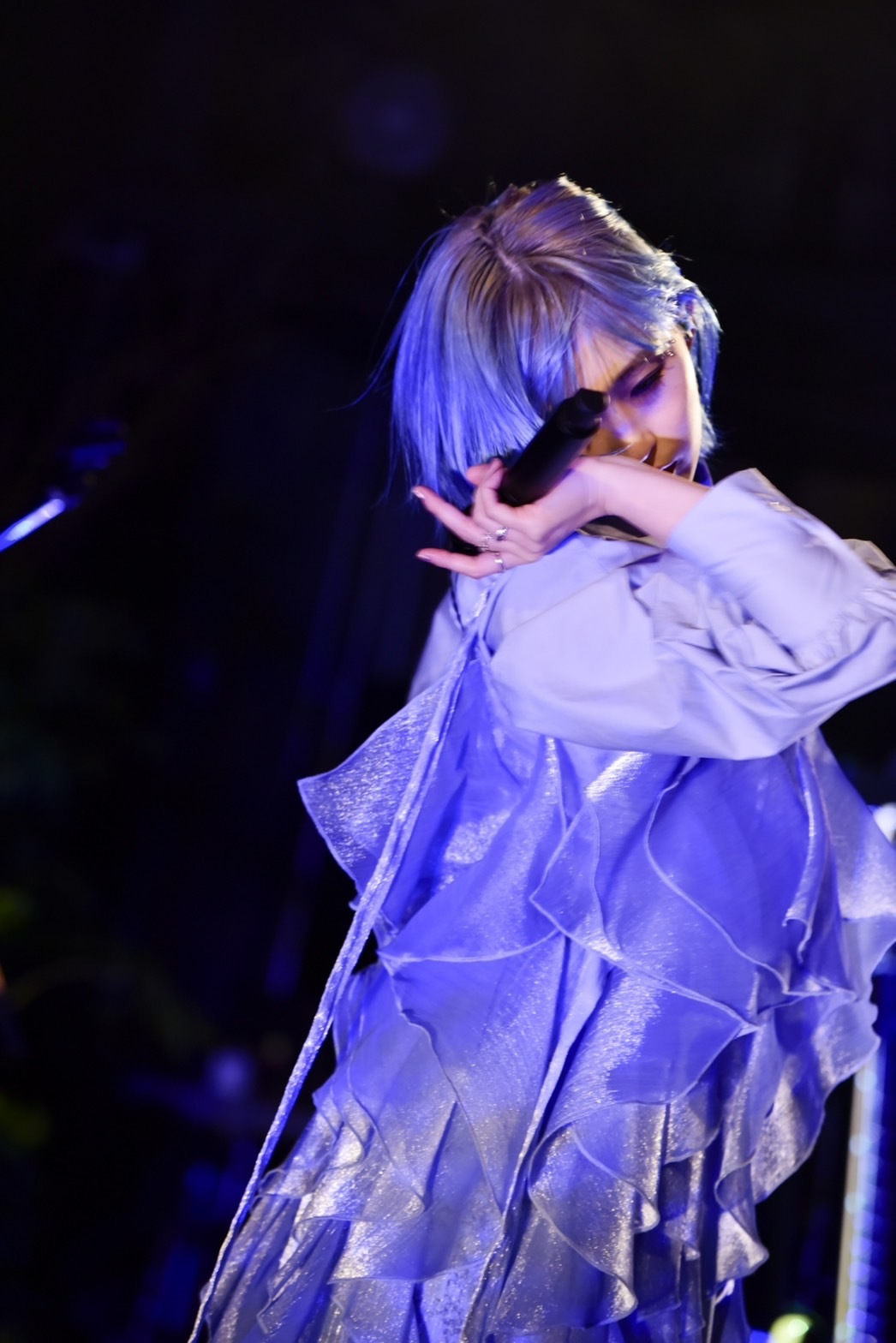 バンドセットと、たくさんの植物が置かれた緑溢れるステージに現れたPiiは、ふわりと風になびくような青いワンピースを纏って登場したのだが、その様子はまるで、凛と咲き誇る花のよう。思わずため息が出てしまいようになるくらいの美しさを体現した彼女が大きく息を吸い、歌い出したのは「花明り」。花が散る、誰かとの別れ、季節の境目。そういった「ひとつの終焉」から薫る切なさや侘しさを、叙情性のある言葉を連ねることで表現した和を尊ぶ楽曲を、じっくりと、それでいて柔らかに歌い上げていく。テーマとなっている花が持つ盛者必衰の生き様と、風に舞い散った時の花吹雪を想起させ、幻想的な世界観をぐっと色濃くさせている。