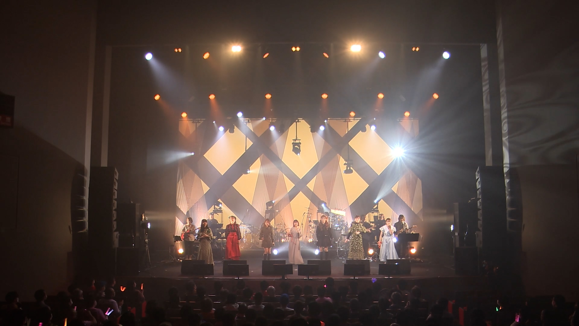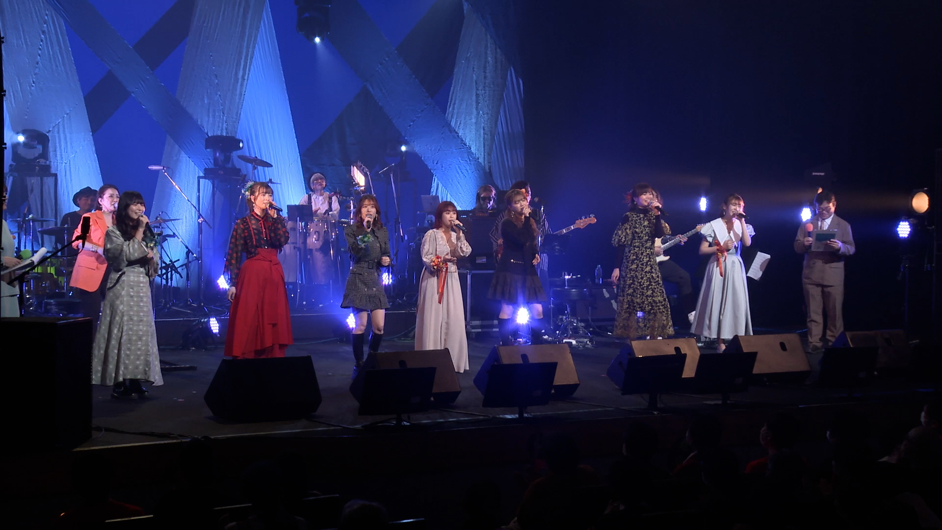 一方、ミント組がセレクトしたのは、「そばかす」、「愛のしるし」、「LA・LA・LA LOVE SONG」。後半戦に向けて会場を盛り上げる気満々、踊らせる気満々。ここまで読んでお気づきかもしれませんが、出演者は7組、チャイ組は4人、ミント組は3人、1人少ない。というわけで、満を辞して応援団長・岡村アナが参戦、歌う気満々です。そしてバンドのメンバーもまた、セットリスト的に「そばかす」は唯一のロックナンバーとあって、音量大きめ、もうガシガシのギッシギシなのです。相乗効果なのか?! 小片のキュートなボーカルにはチラリと毒っ気が滲み、声を合わせるmiuと岡村アナも楽しそう。さらにこの日のPUFFYはなんと、奥津&岡村アナ! 当然、振り付き。客席もペンライトを大きく振って参加します。オリジナル曲では繊細な歌声を披露していたmiuの、力強い豊かな「LA・LA・LA LOVE SONG」には度肝を抜かれた。メインとコーラス、役割によってガラリと雰囲気を変える奥津の表現力にも感嘆した。岡村アナ渾身のラップは……面白かったです(笑)。