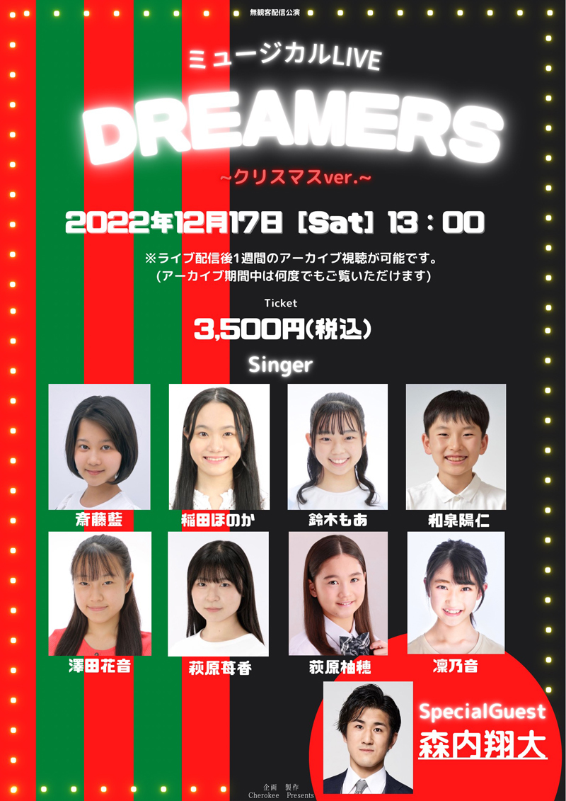 今注目されている子役たちによるミュージカルLIVE『DREAMERS』~クリスマスver.~(無観客配信公演)が、2022年12月17日(土)13:00から配信される(1週間のアーカイブ付き)。