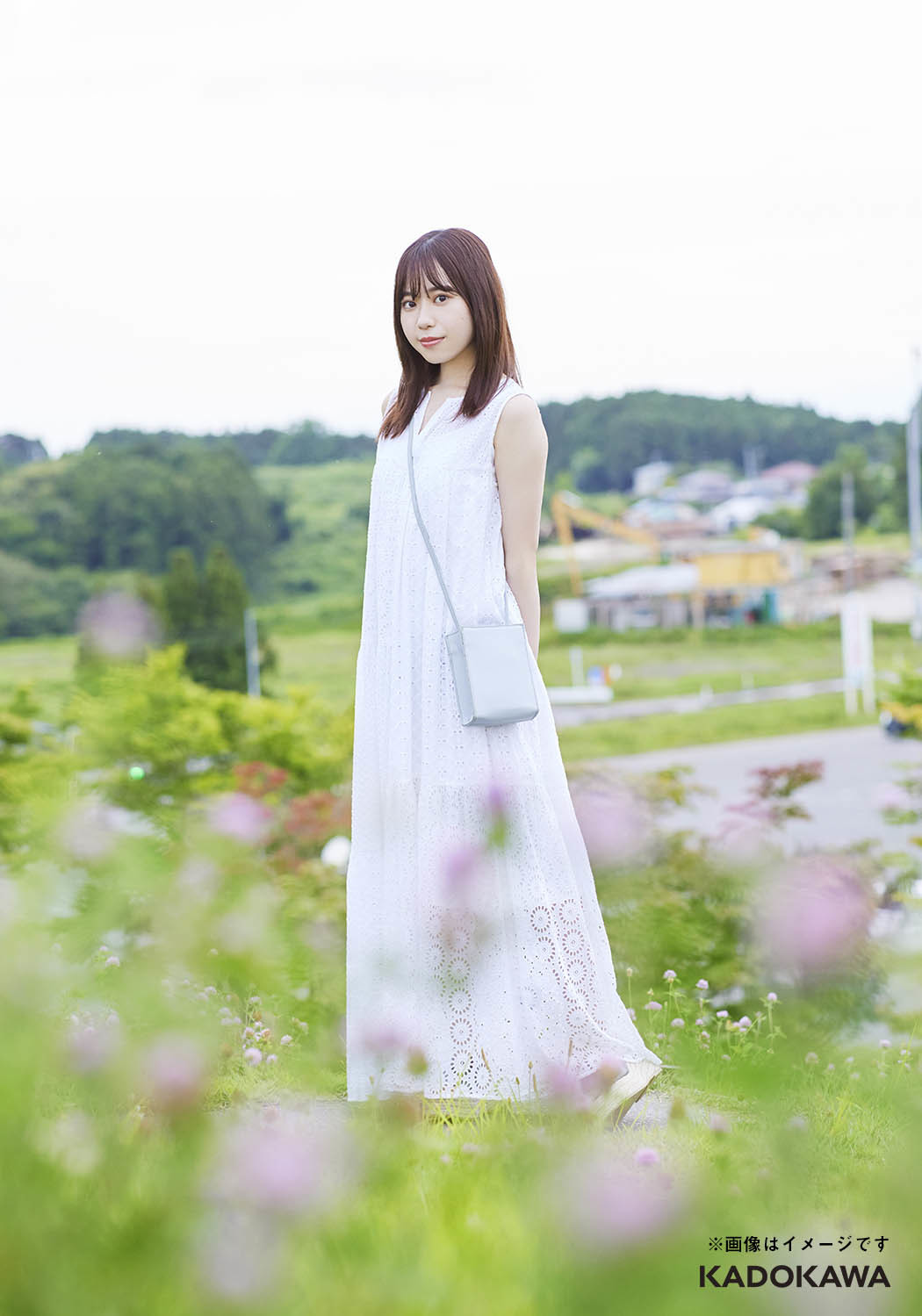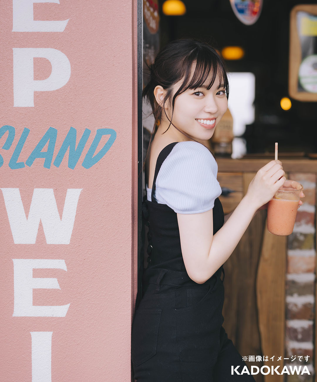公開となったのは、沖縄のカフェでの笑顔が印象的なカットと、透明感あふれる白いワンピース姿のカットとなっている。