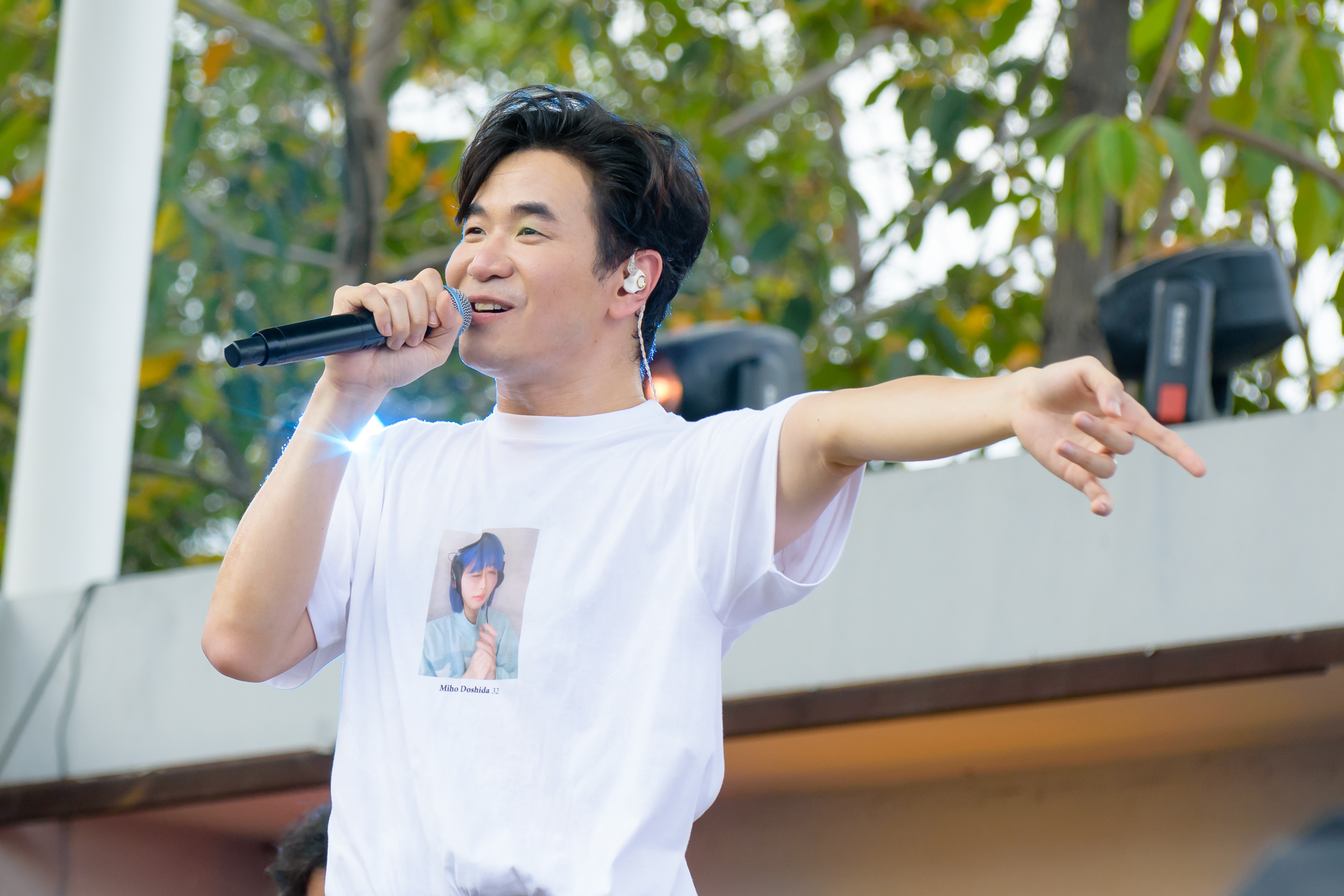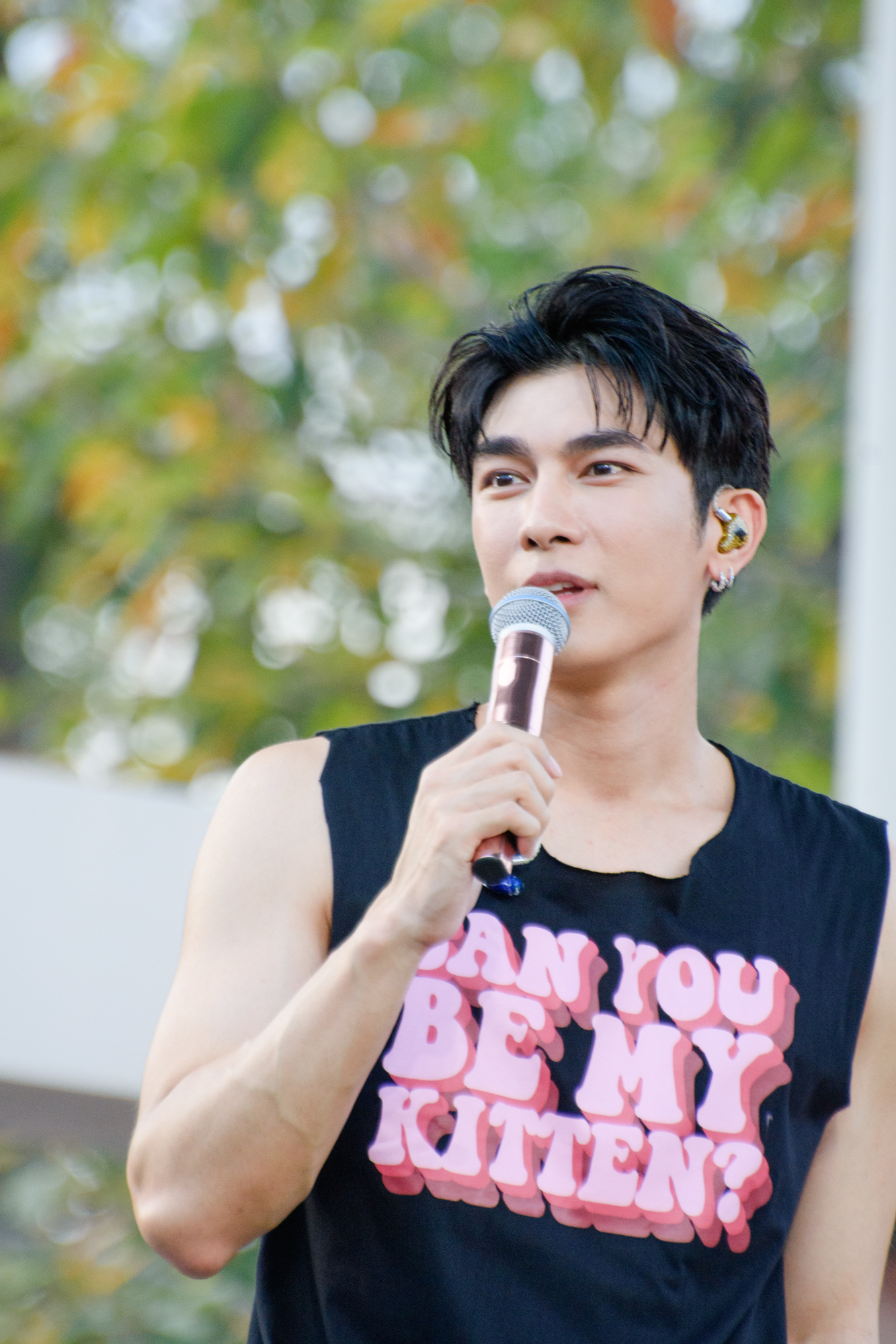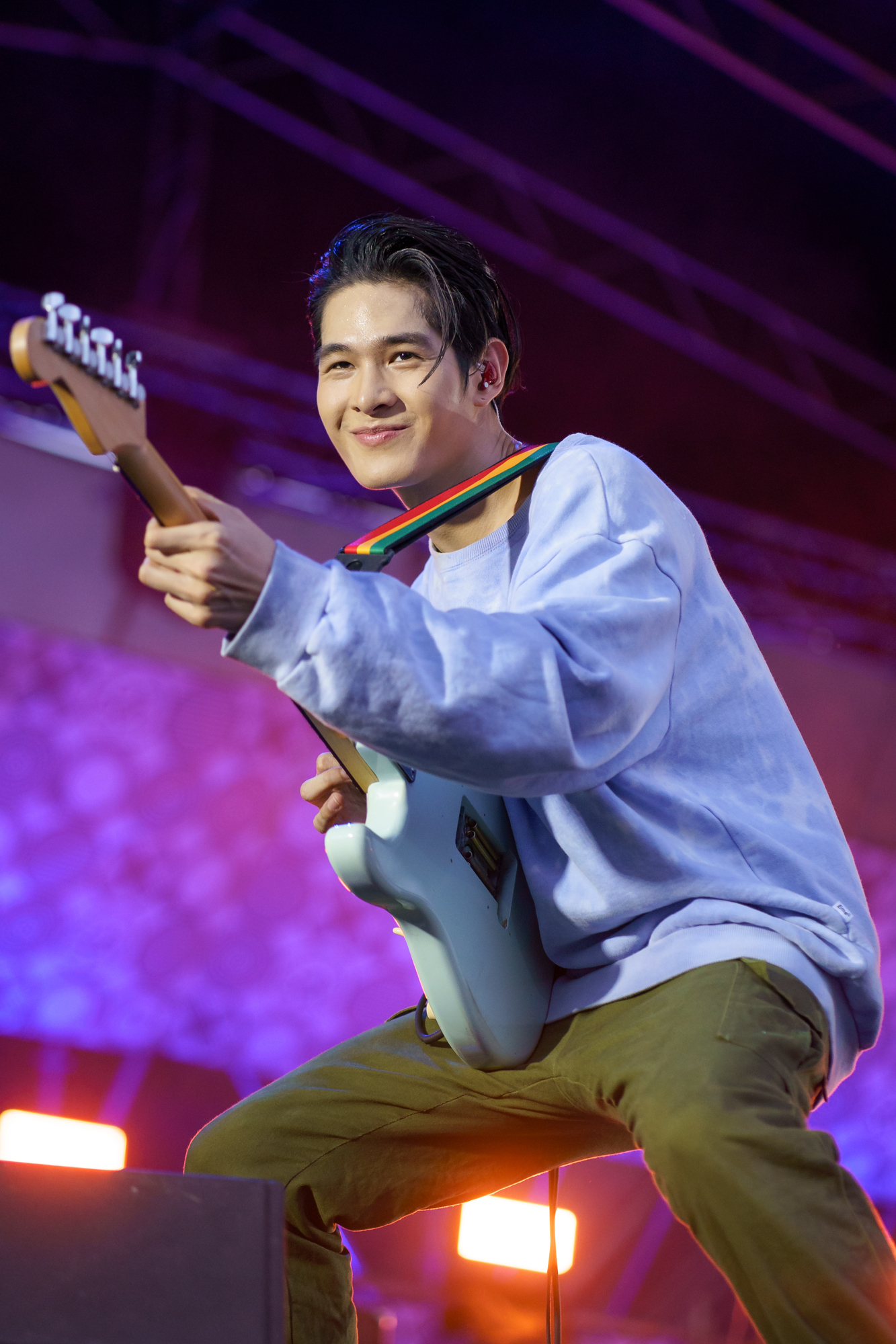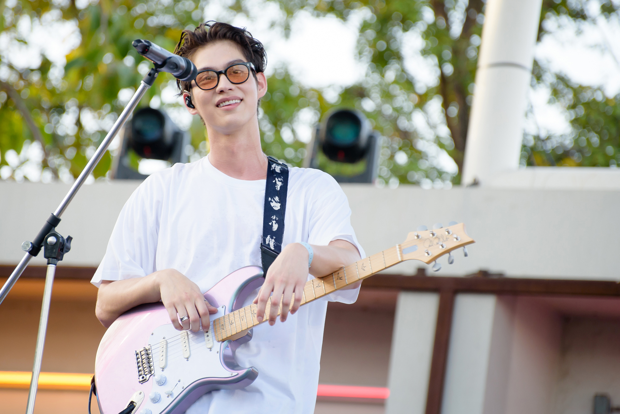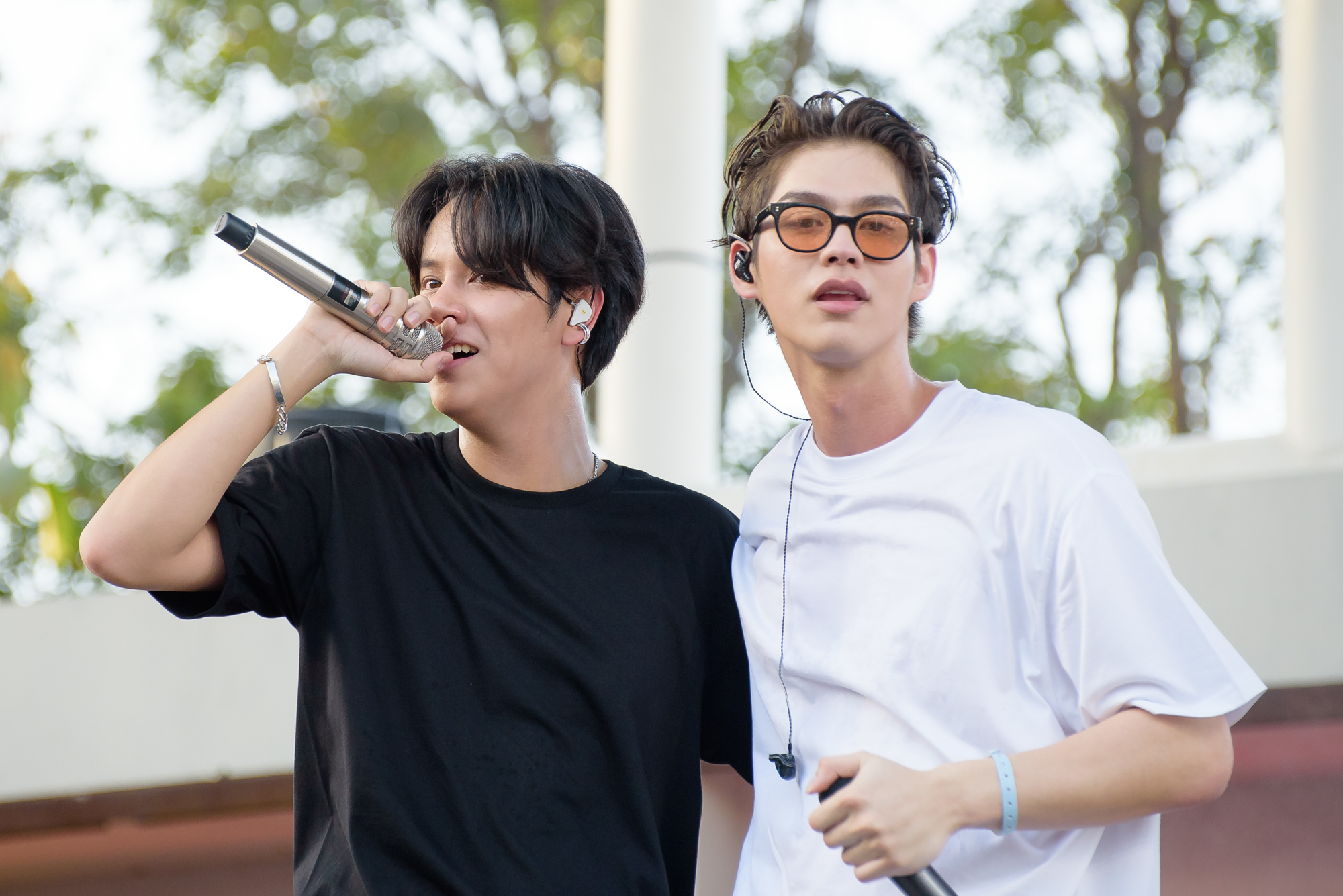 そんな、かつて観客として観ていたステージに、バンドと一緒に立つ彼は、生き生きしていて楽しそう。甘い歌声が夕方の少し涼しくなってきた空気に似合います。突然ファンからバナナの木のプレゼントされるという、本人も戸惑うサプライズもあり! 日本でも大人気になったドラマ『2gether』のエンディングテーマ「Kan Goo」をワンコーラスカバーしたところで、何と本人登場! 『2gether』のサラワット役を演じ、同じ事務所の俳優で音楽活動もしている、ブライト・ワチラウィットがシークレットゲストとしてギターを弾きながらステージに。