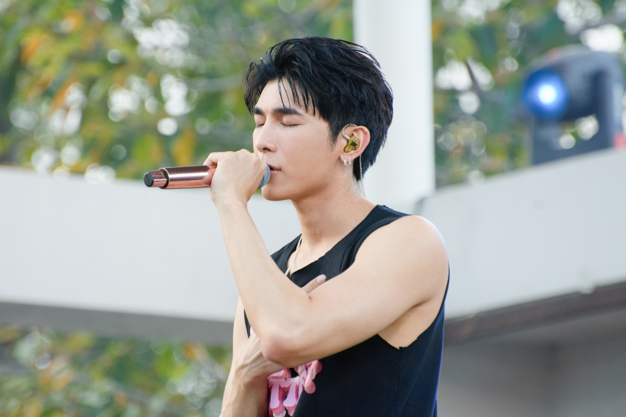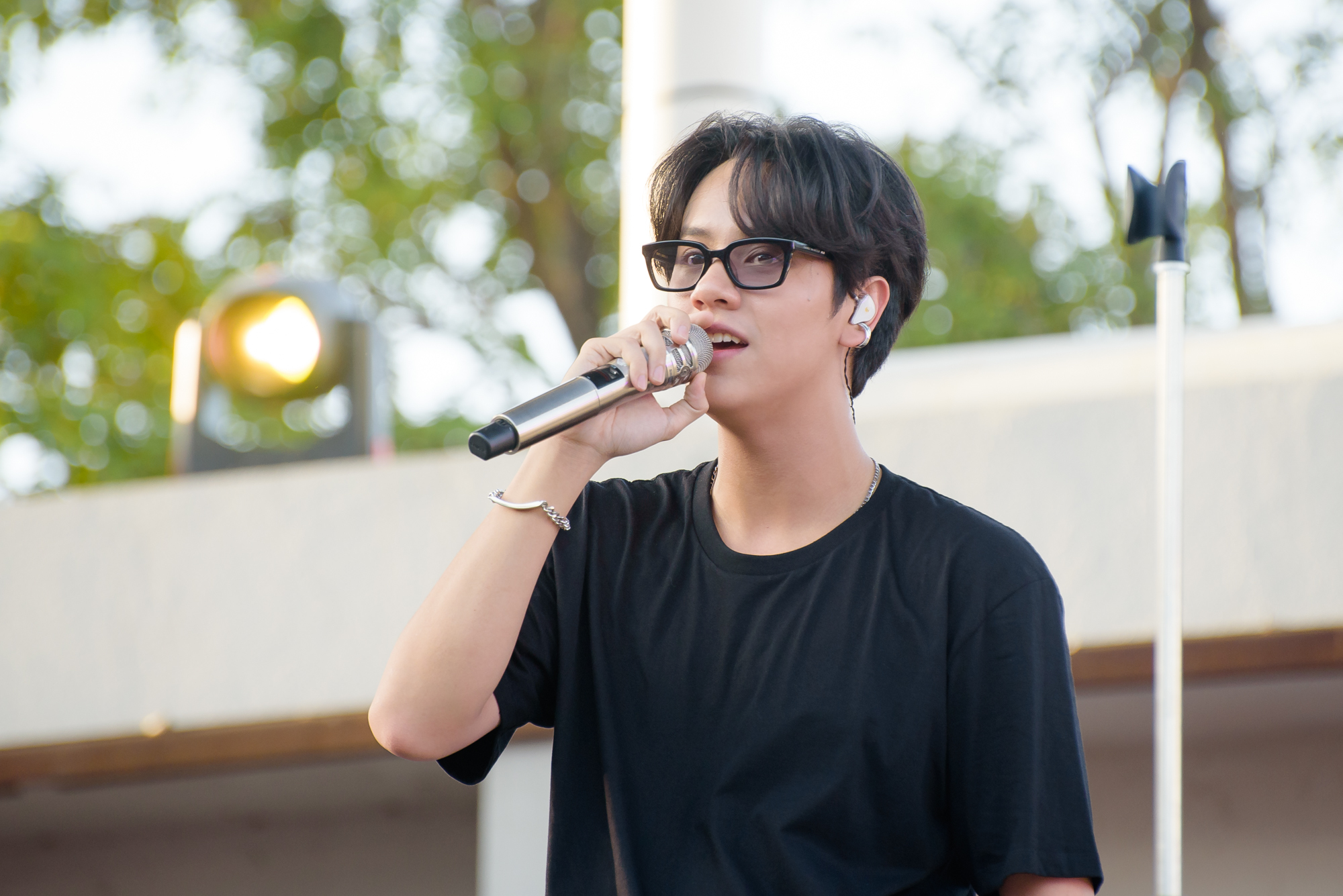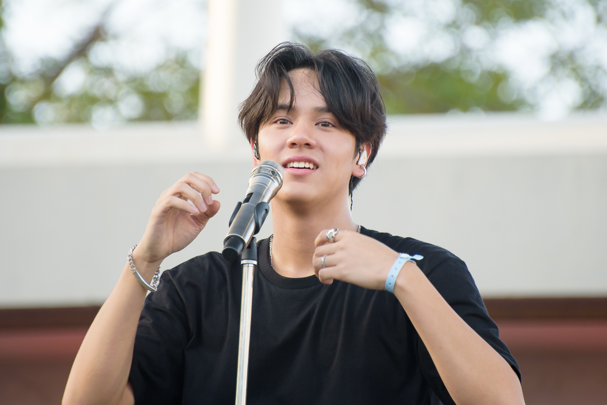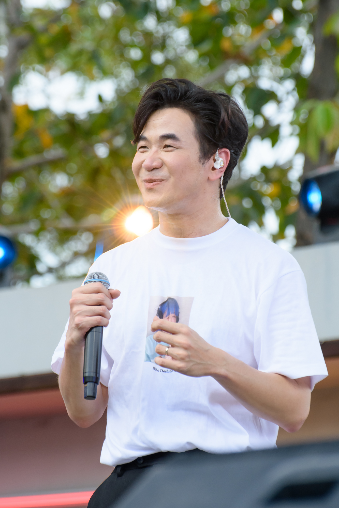 そんな、かつて観客として観ていたステージに、バンドと一緒に立つ彼は、生き生きしていて楽しそう。甘い歌声が夕方の少し涼しくなってきた空気に似合います。突然ファンからバナナの木のプレゼントされるという、本人も戸惑うサプライズもあり! 日本でも大人気になったドラマ『2gether』のエンディングテーマ「Kan Goo」をワンコーラスカバーしたところで、何と本人登場! 『2gether』のサラワット役を演じ、同じ事務所の俳優で音楽活動もしている、ブライト・ワチラウィットがシークレットゲストとしてギターを弾きながらステージに。