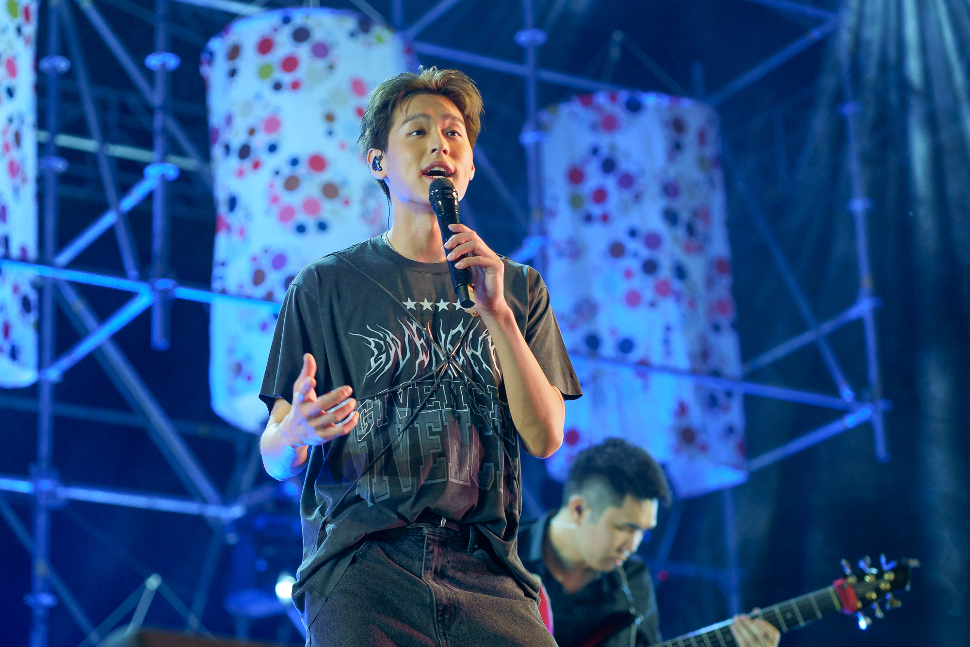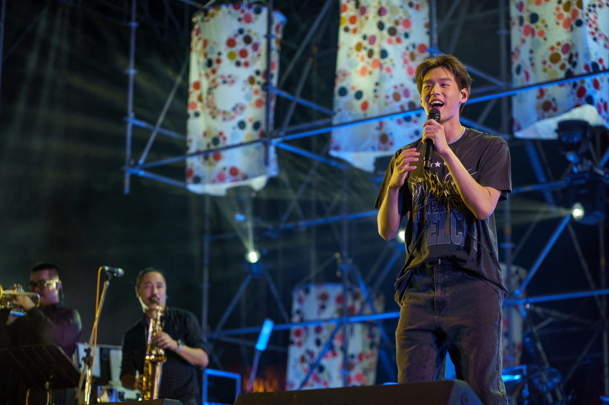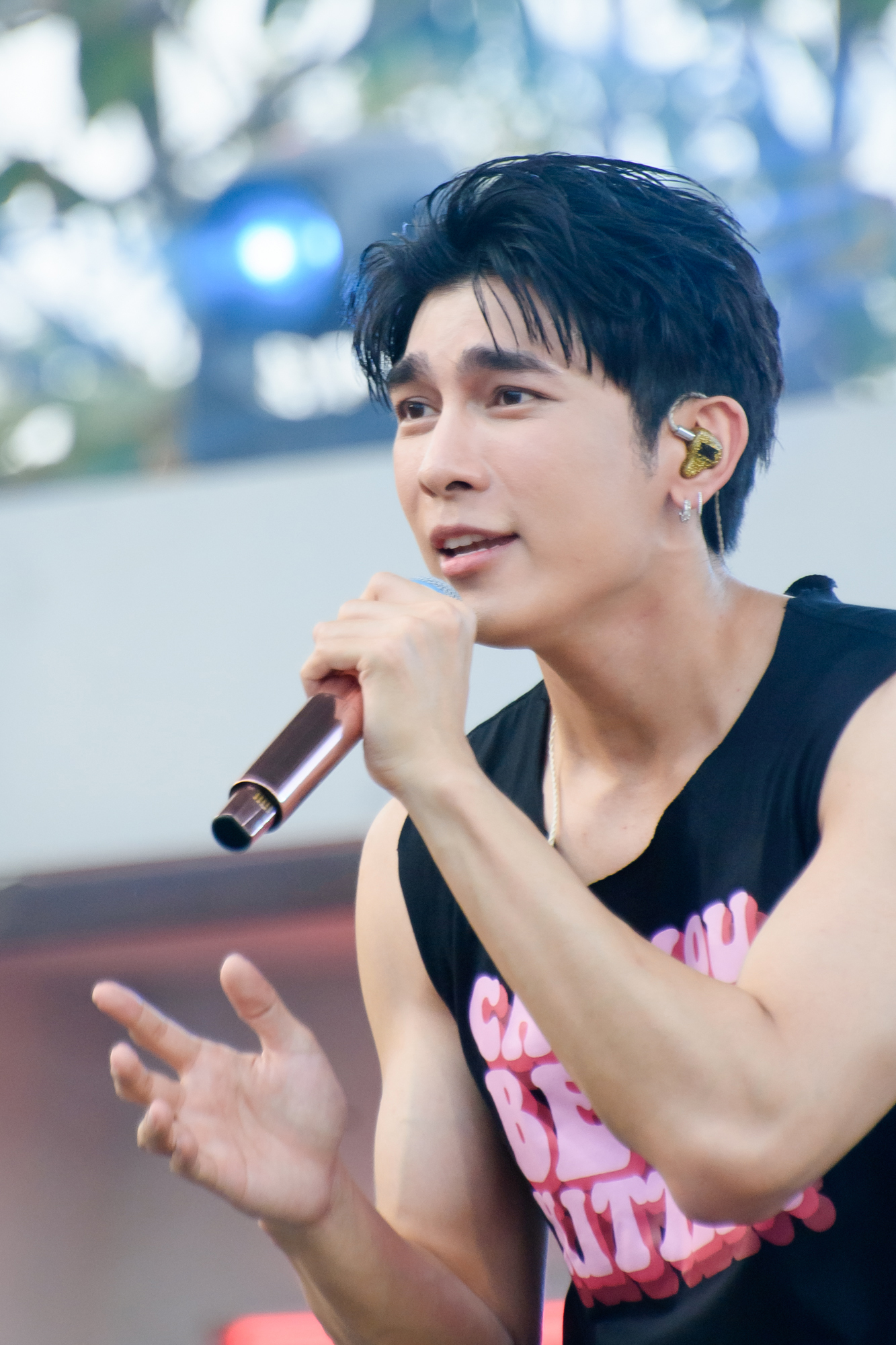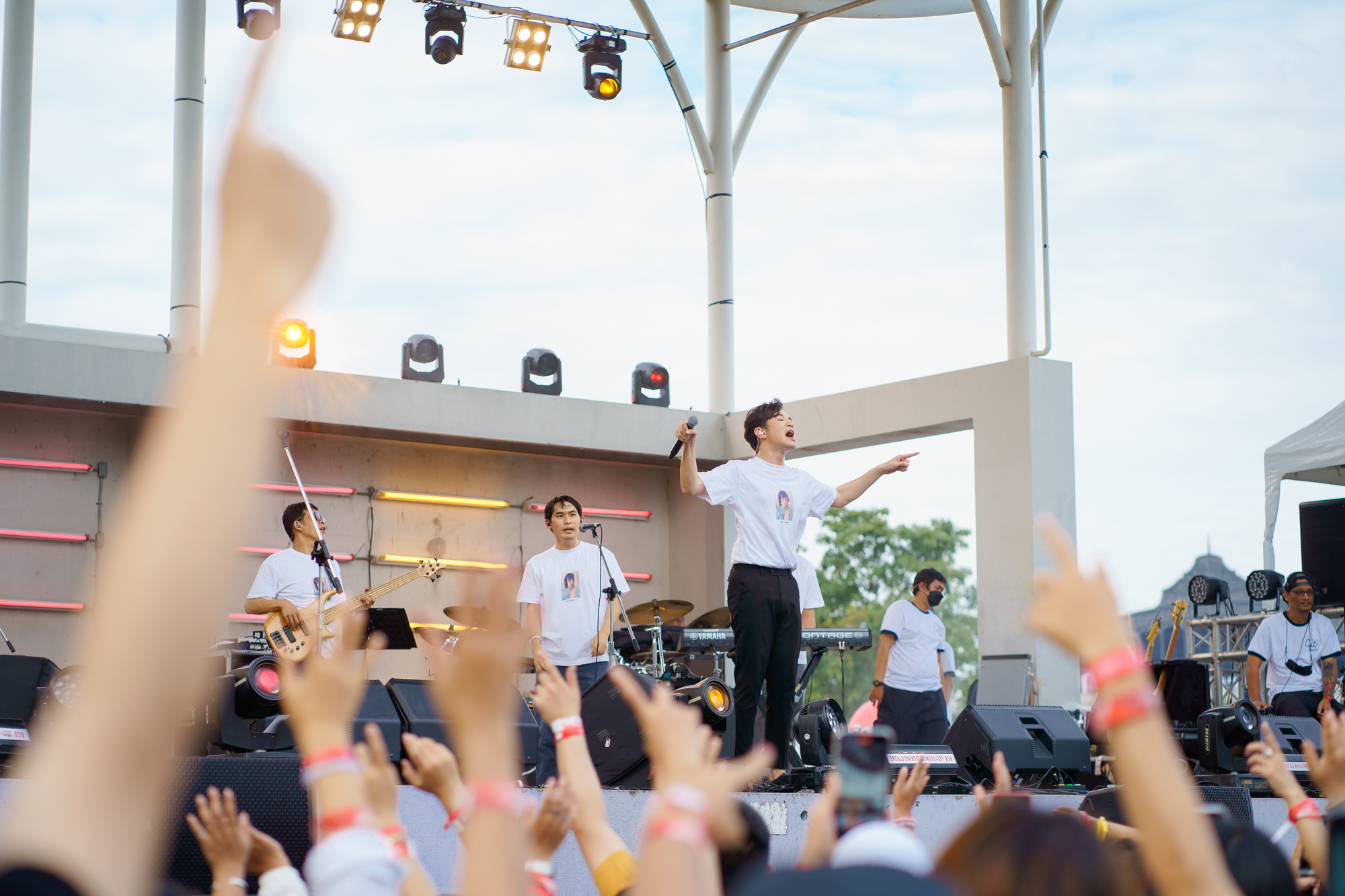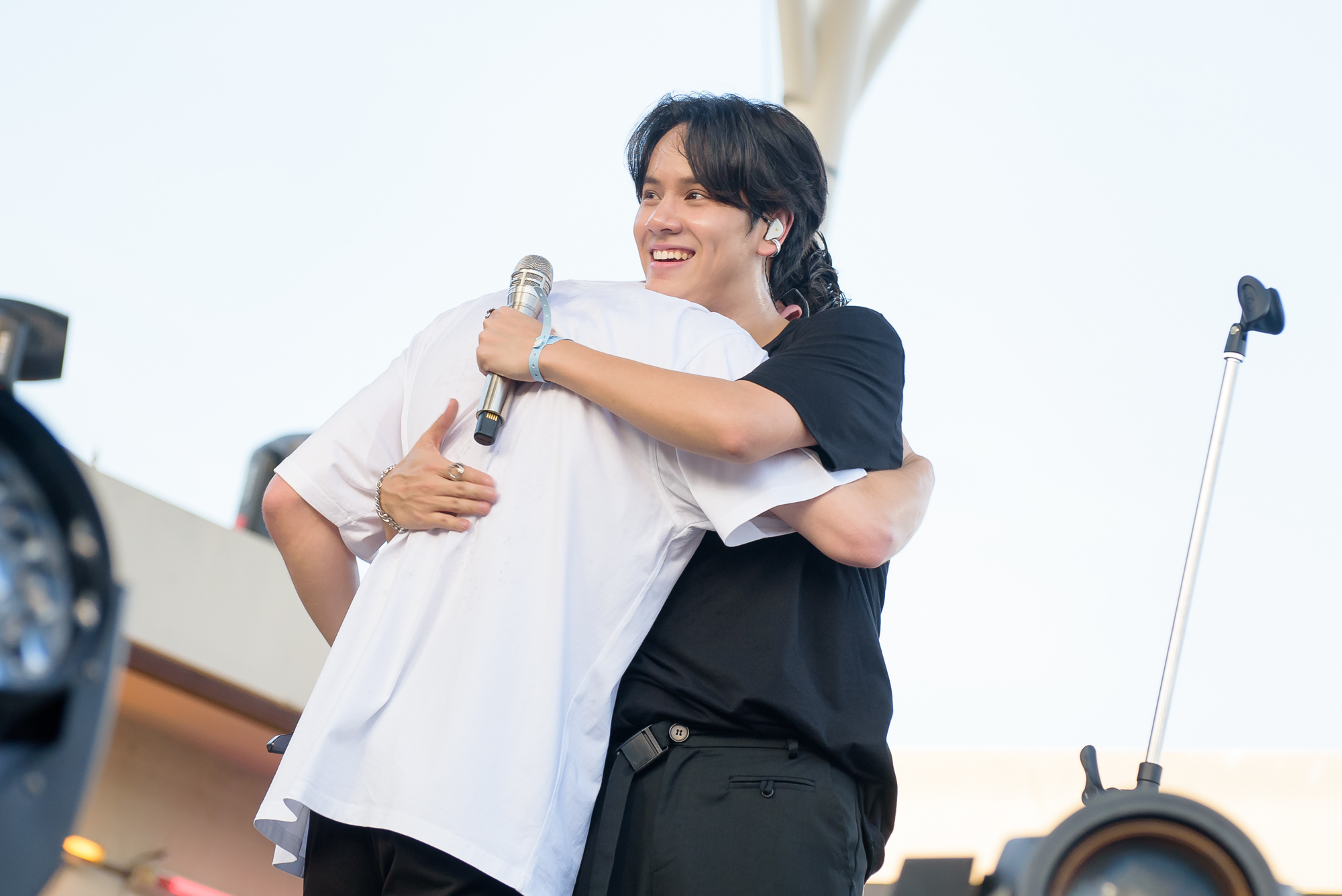 そんな、かつて観客として観ていたステージに、バンドと一緒に立つ彼は、生き生きしていて楽しそう。甘い歌声が夕方の少し涼しくなってきた空気に似合います。突然ファンからバナナの木のプレゼントされるという、本人も戸惑うサプライズもあり! 日本でも大人気になったドラマ『2gether』のエンディングテーマ「Kan Goo」をワンコーラスカバーしたところで、何と本人登場! 『2gether』のサラワット役を演じ、同じ事務所の俳優で音楽活動もしている、ブライト・ワチラウィットがシークレットゲストとしてギターを弾きながらステージに。