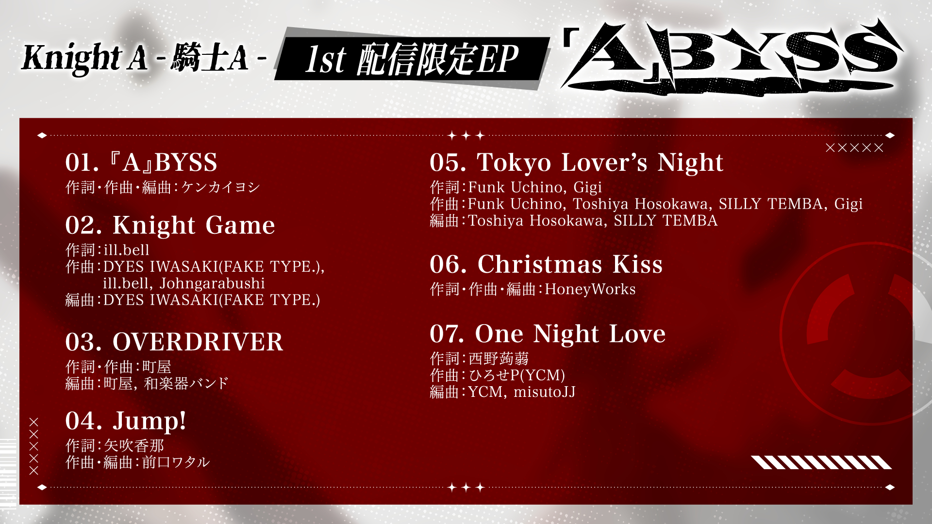 12月19日(月)にリリースされるKnight A – 騎士A -初の配信限定EP「『A』BYSS」から、全収録楽曲情報とクロスフェード動画が公開された。
