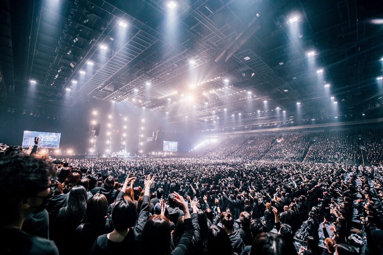 赤×緑だらけのクリスマスマーケットやイルミネーションが煌めく通りを抜け、会場となったさいたまスーパーアリーナへ。そこは観客、コンサートスタッフ、警備員、売られているグッズ、場内にあるKFCのカーネルおじさんまで大きな黒マスクをつけ、見渡す限りどこもかしこも限りなく黒、黒、黒! 聖なるグレゴリオ聖歌をグラウンドビートにのせたBGMも相まって、場内はこれからミサでも始まるんじゃないかと思うほどおごそかな雰囲気に包まれている。