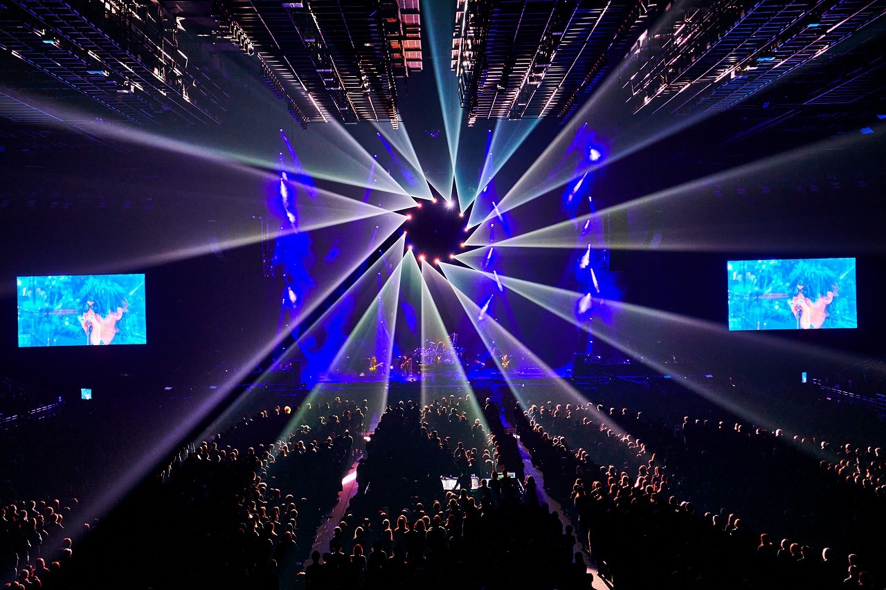 手拍子とともに、スマホのライトを振って観客たちがアンコールを伝えていると、SUGIZOが同じようにスマホのライトを照らして真っ先に登壇。アンコールはバラード「MOON」からスタート。ここではステージ上にあった小さなミラーボールに加えて、途中から大きなミラーボールが下から昇ってきて、2つの惑星となって場内を眩しい光で覆い尽くしていくという演出が美しかった。