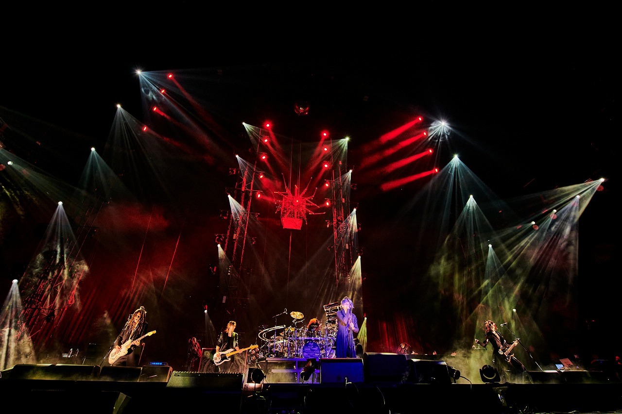 それをもっとも体感したのが「SANDY TIME」。これまでも何度か披露しているこの曲はまさに、LUNA SEAがこれまで放ってきた壮大なスケールを感じさせる神々しい楽曲たちの原石となった楽曲といえる。緊張感たっぷりに5人各々がそれぞれのパートで闇のカオスへと落ちていき、後半は表情一つ変えずに淡々と同じフレーズを弾くJの横で、SUGIZOが派手なパフォーマンスを繰り広げながらソロタイムを展開。終盤、再び歌に戻ったと思ったら、それが突然途絶えて、曲はフィニッシュ。誰も交わることなく、不協和音スレスレのところで張り詰めたプレイを続けるプログレッシブな楽曲。そのヒリヒリしたムードに、ゾクゾクが止まらない。