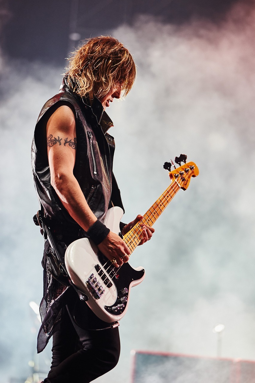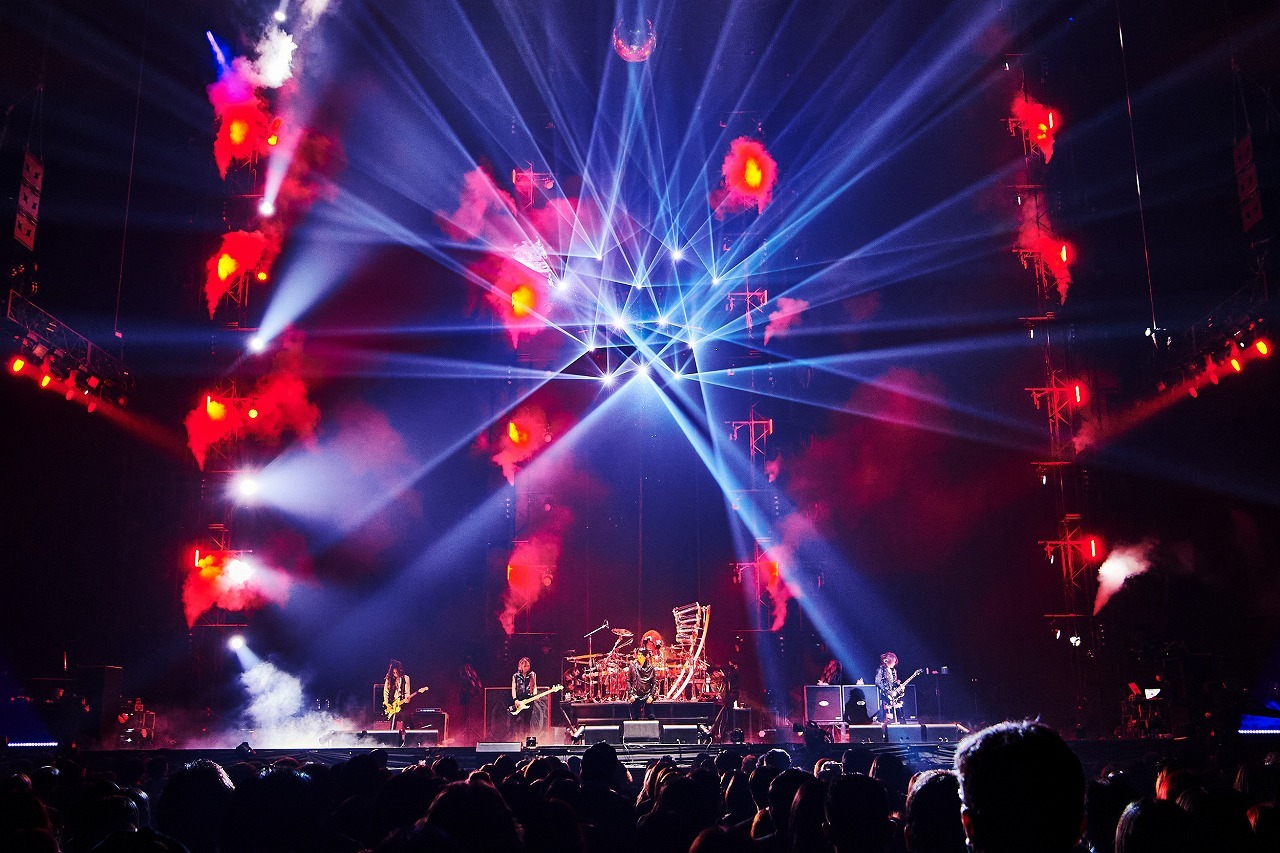 INORANのギターから始まった「LASTLY」のプレイで時をあのときに巻き戻してくれた彼ら。「最狂の夜、楽しんでますか? 飛ばしていこうか!」とRYUICHIが客席を煽って、曲は「CHESS」へ。ステージ後方に立つ4本のタワーの間から炎があがり、Jのベースもその炎のように激しさを倍増させながら炸裂。ここでもRYUICHIのキレキレのシャウトが曲を後押し。攻撃的なサウンドで場内を圧倒したあと、Jのベースソロでつないで曲は「NIGHTMARE」へ。こちらもデモテープに収録されていた未音源化の曲だが、いまの彼らが演奏しても違和感をまったく感じなかった。アウトロでは一人ひとり、歌と演奏が終わった順番にピンスポットが消えていき、RYUICHI、SUGIZO、INORAN、真矢が次々とステージを去ったあと、最後に一人だけ残ったJがこの曲のメインフレーズを弾き続けて曲を終わらせた。第1部のオープニングを逆再生するようなパフォーマンスで、ドラマチックな第2部を締めくくってみせた。