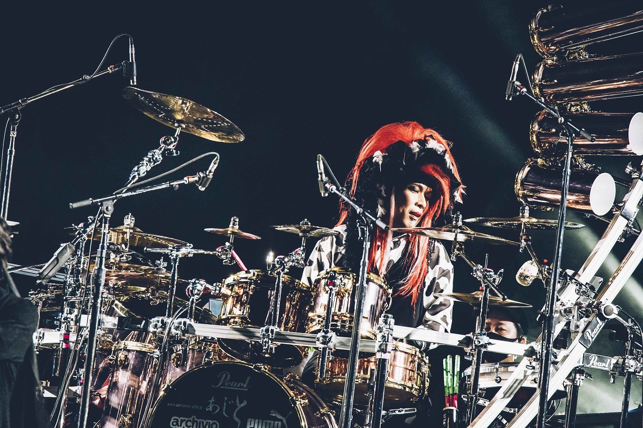 「最狂の夜を楽しもうぜ。ネクストソング、『MECHANICAL DANCE』」とRYUICHIがタイトルコールをして始まった「MECHANICAL DANCE」は、白煙の柱がステージを取り囲むように下から吹き上がる。この曲の主役はJのベース。Jが右手をパーンと掲げたあとバッキバキの音でベースソロを弾き、そこに真逆にあるクリアな音色でINORANがアルペジオを絡ませ、作り出すアンバランスな音像。この緊張感は初期の彼らのサウンドの特徴。続いて演奏した「BRANCH ROAD」もリズム隊が曲をリードしていくナンバーで、こちらは曲中すべての音が止まってサイレントを作るパートがあり、その緊張感がマックスに高まったところで音がブレイクしていくところがたまらない興奮を呼び起こす。その興奮をRYUICHIの深いディレイがかかった《絶望》という叫び声が締めくくっていく。キャッチーさはほとんどなく、あまりにも実験的な初期ナンバー。けれど、それをいまのメンバーのテクニックでプレイすると、これがしびれるほどカッコよく聴こえるというマジックが起こるのだ。
