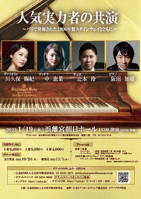2023年1月19日(木)浜離宮朝日ホールにて、人気実力者たちによる室内楽コンサート『人気実力者の共演~パリで発掘された1906年製スタインウェイとともに~』が開催される。