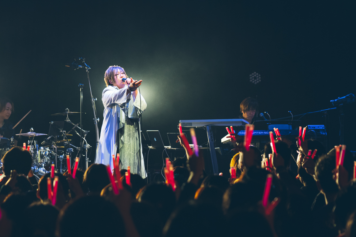 この後、「次が最後の曲です」という言葉にファンが地団駄を踏むという、お約束の流れに。一時音楽をやめかけていた自分に声をかけてくれた仲間と作った「silent decide」から、本格的に音楽の世界へ戻してくれた今のバンドメンバーと出会って、共に作り、タイアップ(ダンガンロンパ)にもなったという始まりの曲「再生-rebuild-」から強いメッセージソング「断鎖-break-」を畳み掛けるように歌い上げ、ステージを後にした。