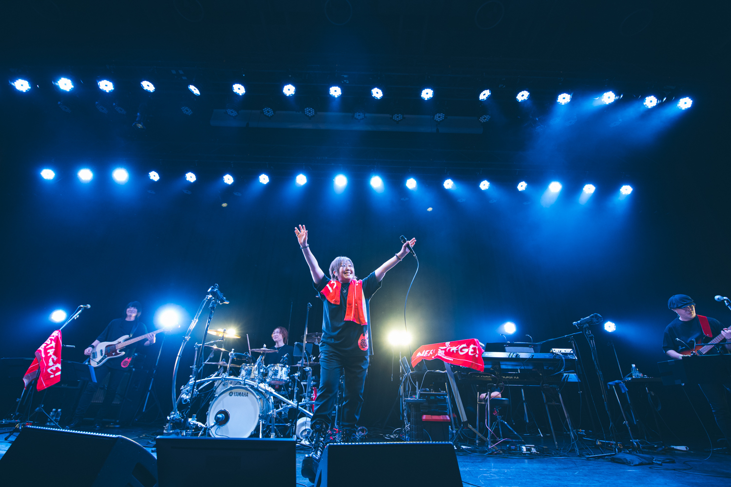 旅を楽しんでほしいという思いを込めて披露されたのは「タイム・リープ」。そして子供の声で歌う「たんぽぽ」、少年声の「正直さの内側」、青年声の「青い宝石の君」と続くこの4曲は、恋愛が育っていく過程が分かるような並べ方をしたとのこと。「正直さの内側」は、「商業ベースで初の作詞作曲。めっちゃ90年代だよね?」としみじみ。