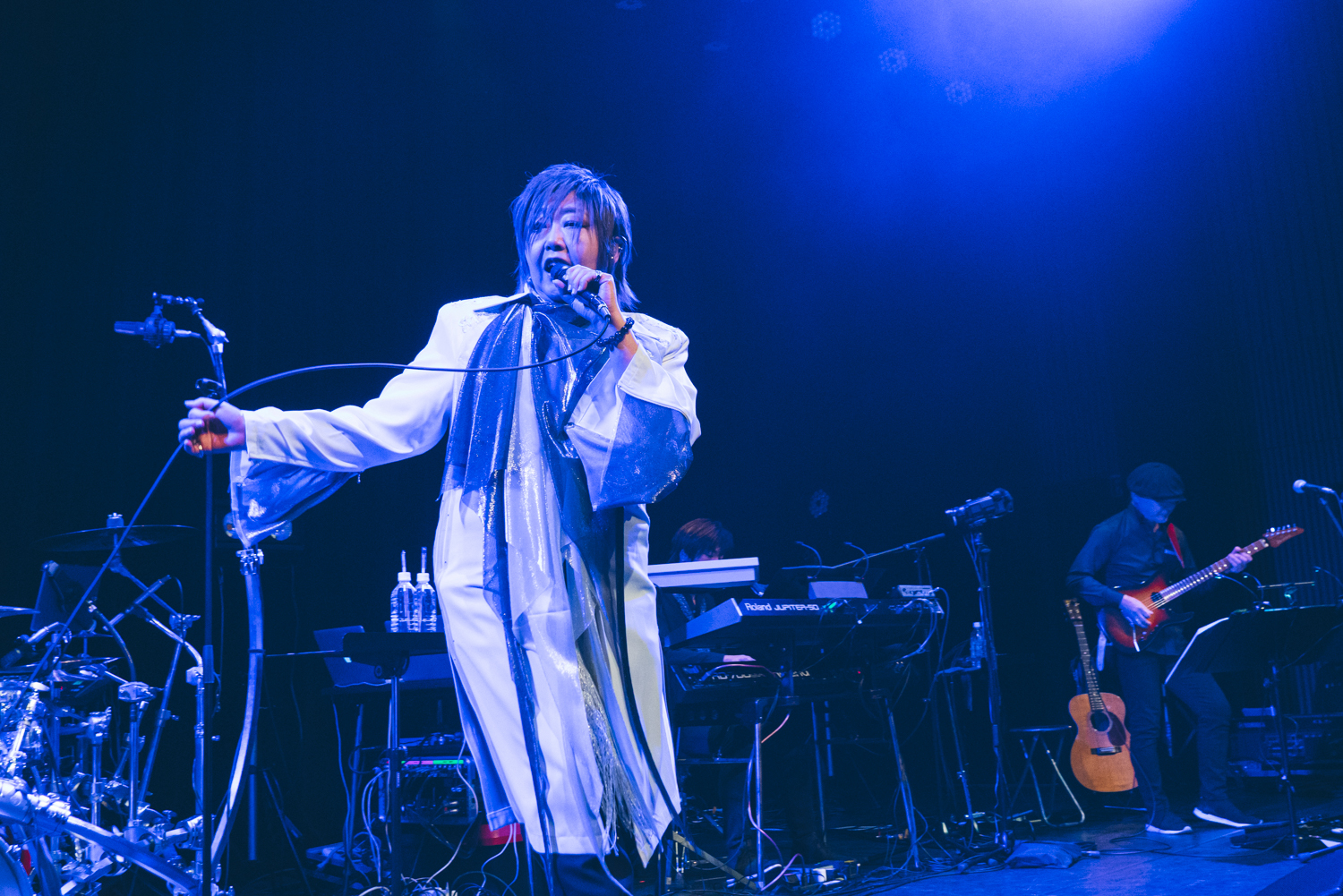 配信で視聴のファンにもカメラ越しに「みんなもありがとう!」と挨拶するとまずは衣装についてコメント。普段はあまり着ないタイプの服としながらも、30周年記念パーティーということで「今日は特別に」とちょっぴり照れた様子。ライブ後にはファンから「王子様みたいだった!」との声が漏れ聞こえていた衣装はシンガーの川村ゆみが手がけたものだと明かし、「ゆみちゃんの愛と、愛を発生する方々の愛に包まれつつお送りします。ここは愛のるつぼだな!」とうれしそうに叫んだ。
