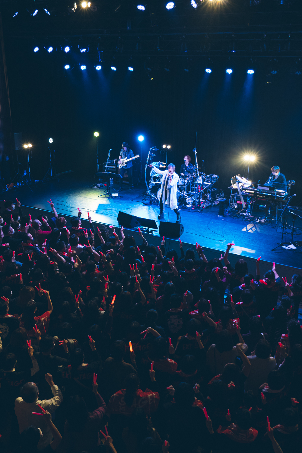軽快なトークで盛り上げる緒方に会場が笑顔に包まれる中、次に披露する「建設途中のビルの上から」「”sunrise,sunset”」「ENDLESS LOVE」の楽曲の中から「ENDRESS LOVE」について言及。「自分にとって鎮魂歌のような曲」だとし、この楽曲を披露しているときには、亡くなってしまったファンや仕事仲間がここに集まっているように感じられればと話していた。