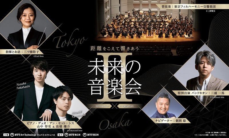 2022年3月に、NTTグループが開発している低遅延通信技術で渋谷と西新宿をつなぎ、通信による時差を感じない“リアルタイム・リモート演奏”に成功した『未来の音楽会』。第二弾となる本公演では、400km離れた東京-大阪に加えて、神奈川・千葉の1都1府2県をつなぎ、一つのハーモニーを奏でる。