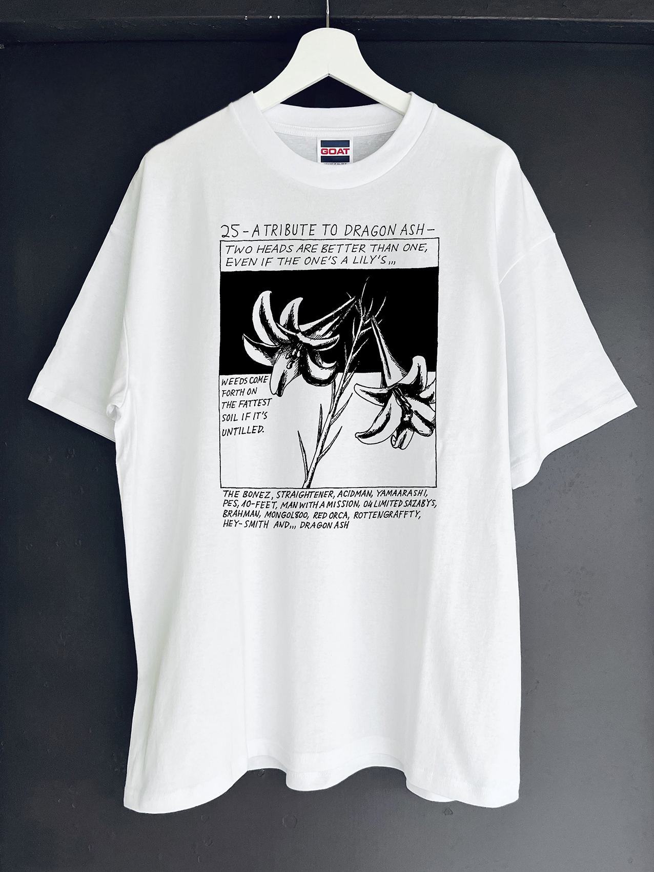 そして、ジャケット写真も公開となった。参加アーティストの発表以来、各バンドのSNSで公開されている告知映像にて、アルバムジャケットにバンド名が連なり完成していく過程を表現していたが、今回ついに公開に至った。デザインはアートディレクター・河原光(TLGF)。Dragon Ashのシンボルである“百合の花”をモチーフとしたグラフィックとなっている。