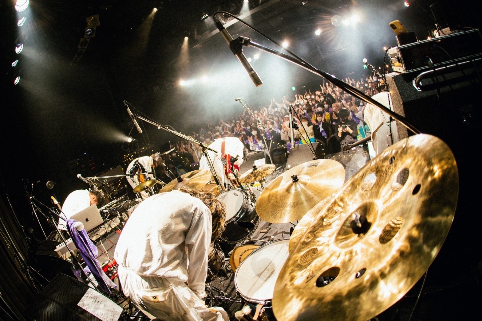 フロアに入る前からこれまでのアートワークが飾られていたり、ファンの寄せ書き用のフラッグが飾られていたり、世界観を感じられるプロセスが楽しい。実は私自身はライブは初見だ。“ファンタジーを創るバンド”というキャッチフレーズを持つ彼らは別に現実逃避しているわけでもおとぎ話を描いているわけでもなく、リアルな現実に拮抗できるほど、彼らの音楽にしかない現実を創り上げていることは音源からも分かっていた。だが、ライブを見て、それが決して内側に向かうことなく、あらゆる世代にエンタテイメントとして開かれていることに強く感銘を受けたのだ。こんな凄まじい意欲と才能とスキルを持ったバンドをこのキャパシティで確認できる機会を得られて良かった。
