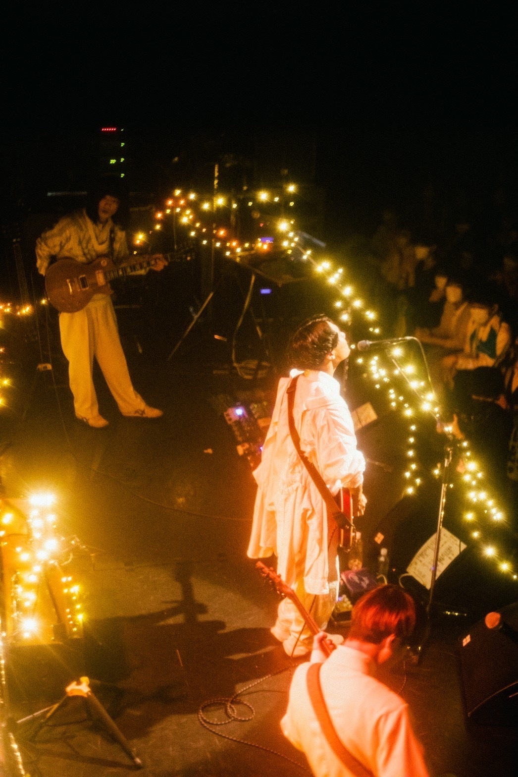 終盤はこれまた素晴らしい設定だと思った「再会の街」。会えなくなった人が再会できる街が存在するようだが、貧乏な少年はお城にいるプリンセスに会えない。そこから《メロディがあればなんとかなるさ》とか《おんなじ月を見てると思えばずいぶん楽だ》という主人公の心情が歌われ、聴いているこちらも思いを重ねることになる。「再会の街」は音源通り「ヨエツアルカイハ1番街の時計塔」につながり、山本のシューゲイズなギターが街に嵐を起こすようだ。アウトロで、少年がプリンセスに見つけられたのは小さな少年の背中に大きな翼を見つけたから、という結末が語られた。音楽だから、そうした起こってほしい奇跡を素直に受け入れられるのかもしれないと、この曲で感じた。