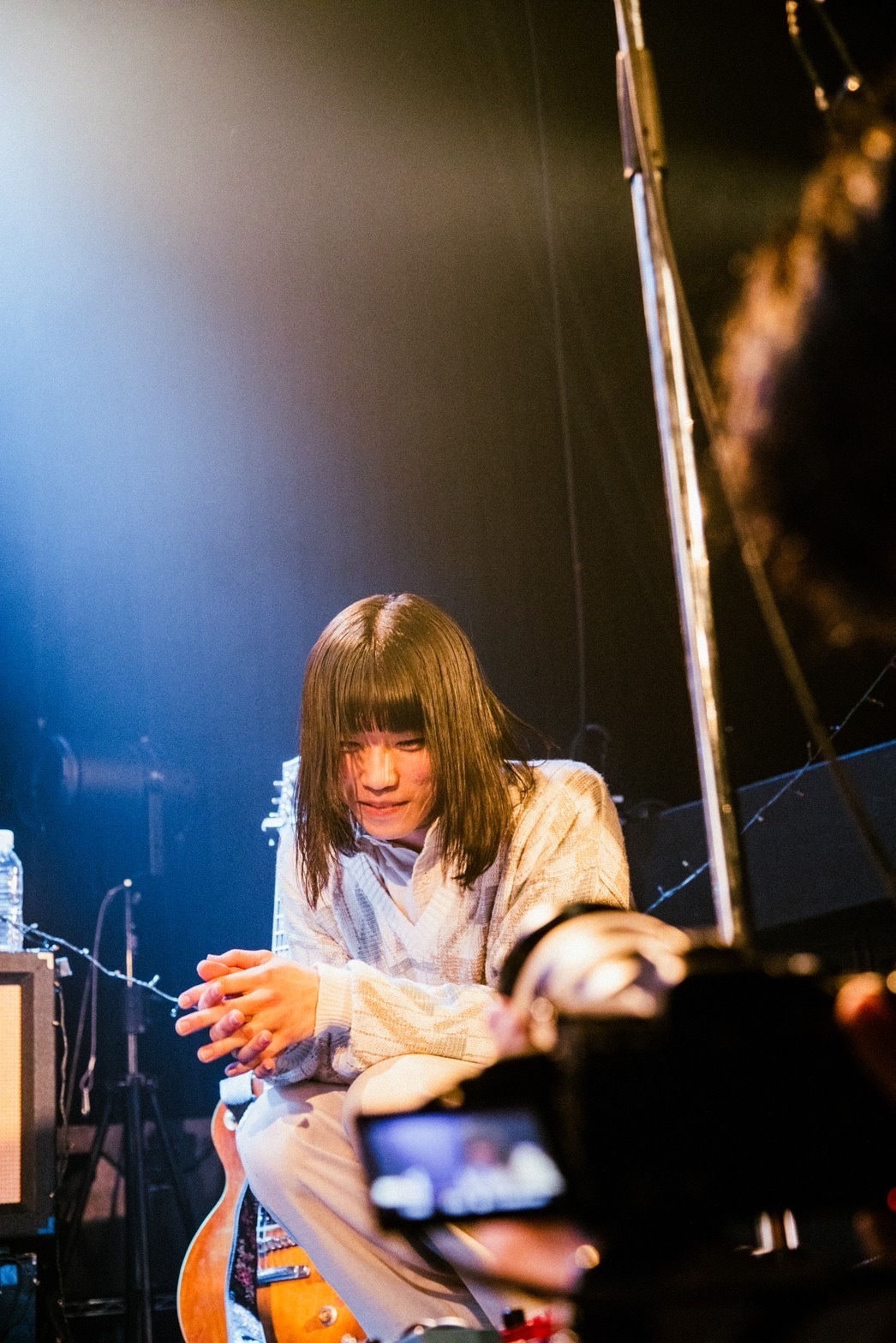 宮崎の「ドラムス、タイムトラベラー・ビート!」という司令(?)で秦がソロを決め、まさにタイムリープの感覚で「時間旅行」が披露され、続いてアイリッシュ風のフレーズやリズムを持った「オロカモノ美学」へ。フォークロアな曲調で山本が何食わぬ顔でタッピングしているのも頼もしい。宮崎の「会場が割れるぐらいのクラップお願いします!」という声に応えて誰もが精一杯手を叩く。続いてはある日突然、音楽をやめてしまった人をテーマにした自分なりのラブソングであることを話し、「歌姫は海で」の意味を反芻してしまった。